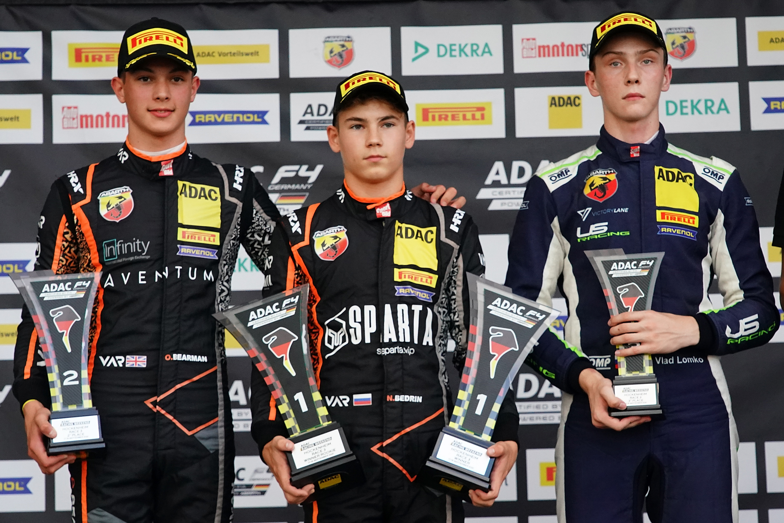 Siegerehrung nach Rennen 3: Nikita Bedrin (Mitte) gewann vor Oliver Bearman (li) und Vlad Lomko (re)