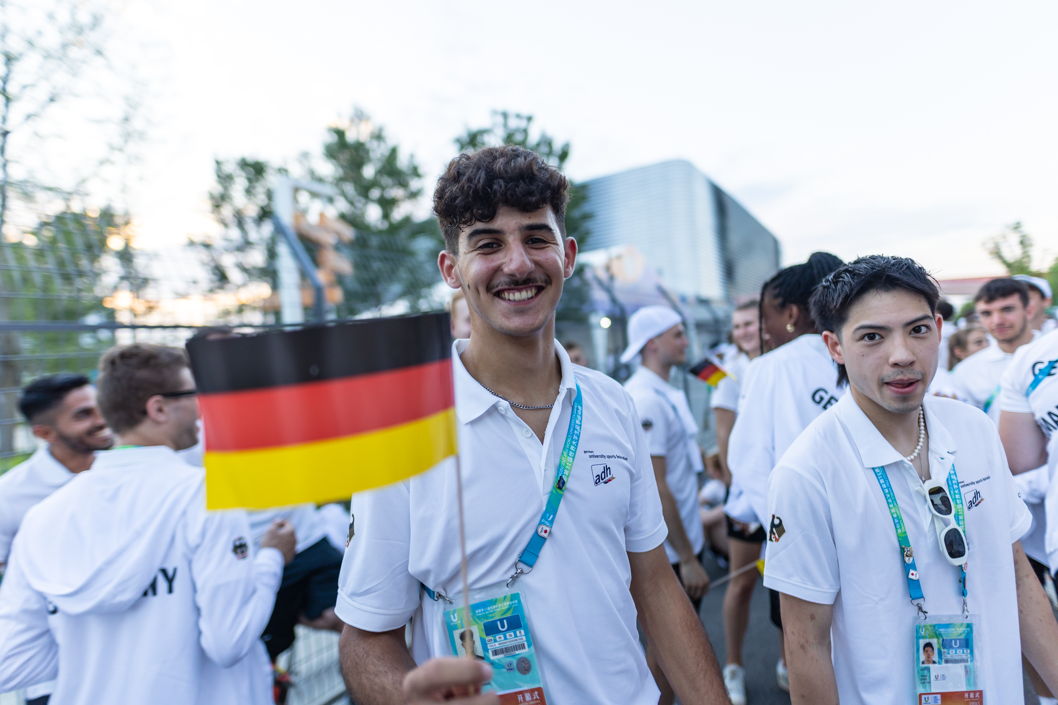 Deutsche Athleten bei der Opening Ceremony der FISU Games 2023 in Chengdu