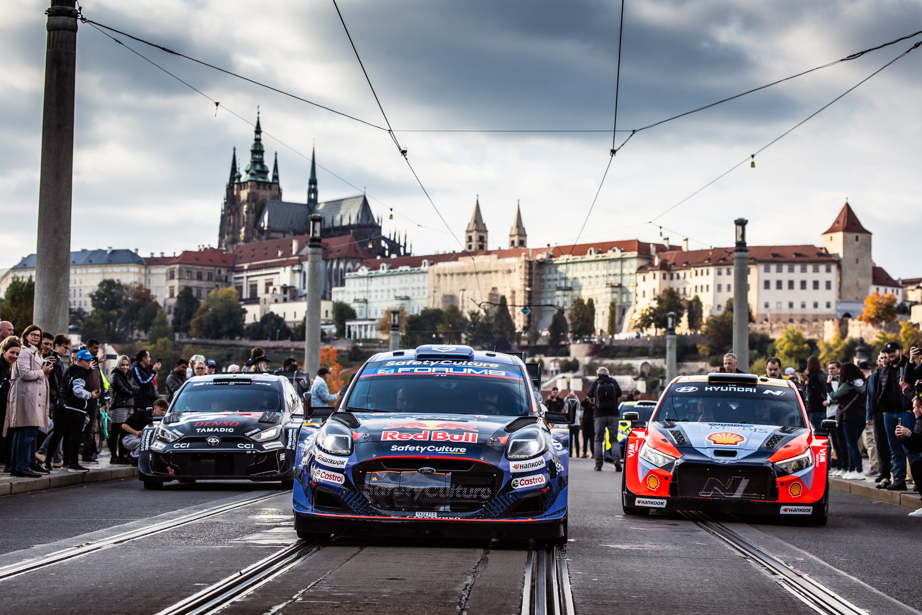 Prächtige Kulisse für die weltbesten Rallyepiloten: Im Herzen von Prag gaben sich WRC1-Piloten von Toyota, Hyundai und Ford die Ehre und fuhren im Konvoi entlang der schönsten Sehenswürdigkeiten der Goldenen Stadt