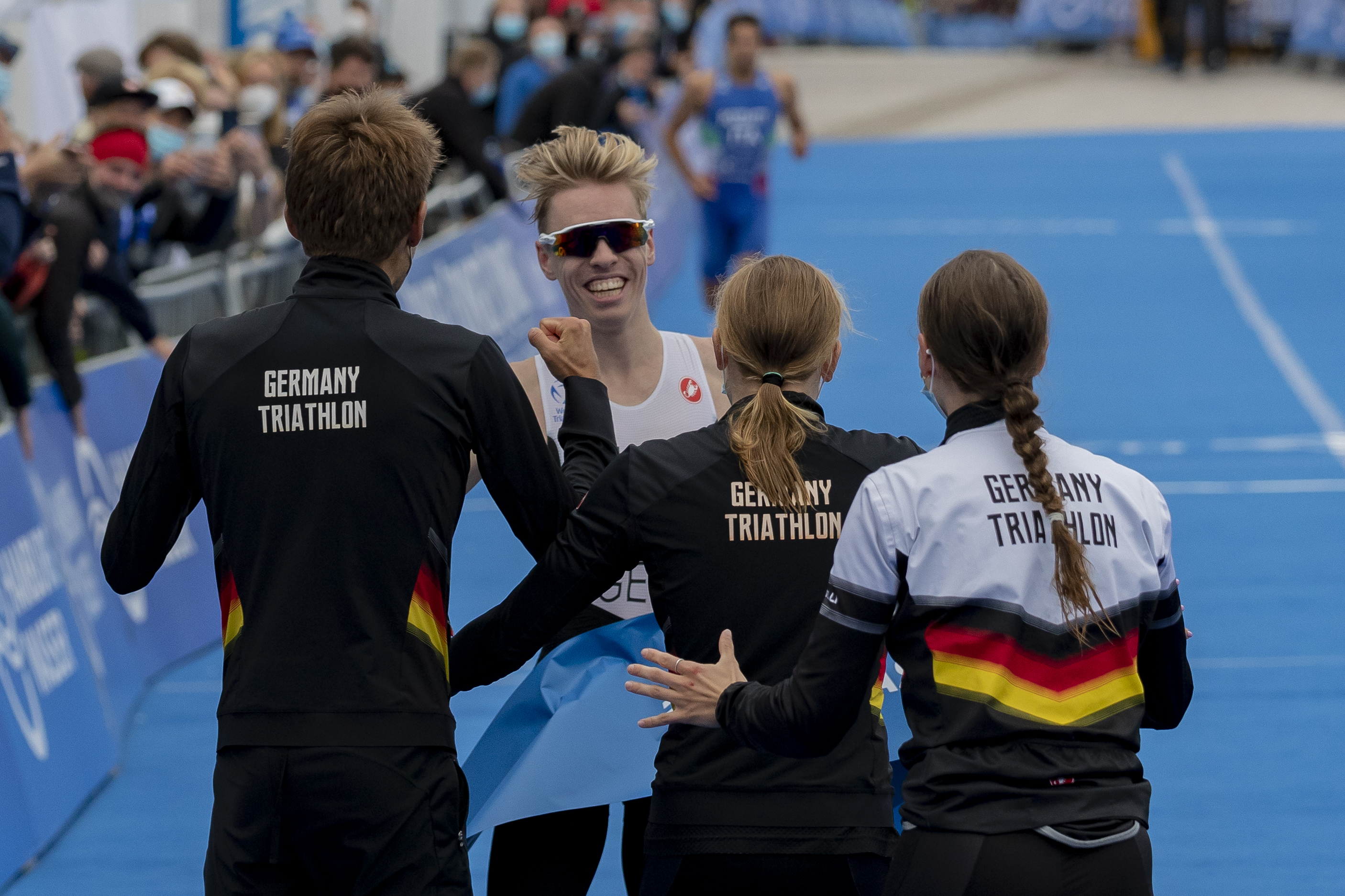 (von links) Lasse Priester, Tim Hellwig, Laura Lindemann und Marlene Gomez-Göggel beim Erfolg im Mixed Relay beim WTCS-Rennen in Hamburg 2021