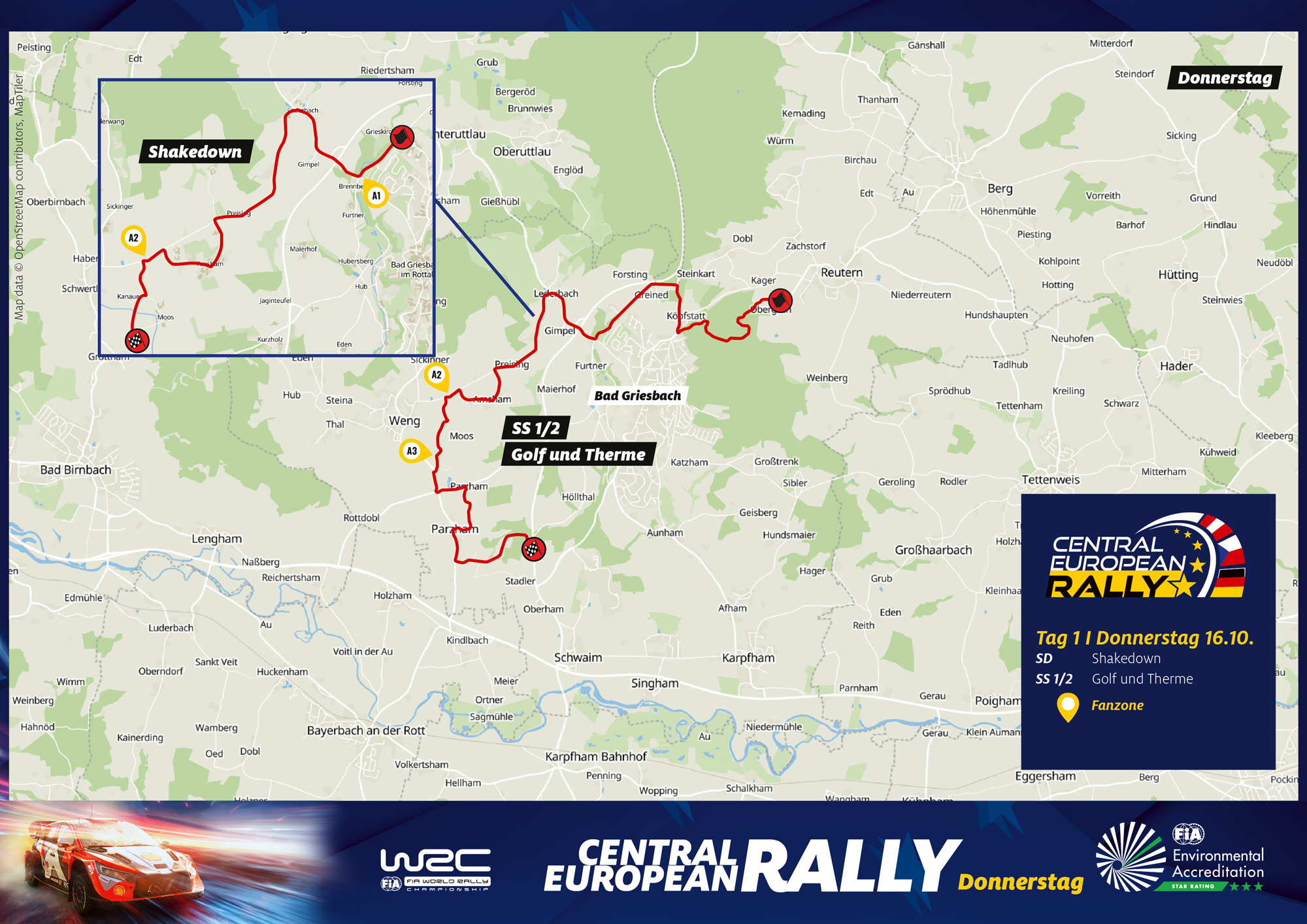 Dateiname Tagesübersicht für die CER-Zuschauerpunkte am Donnerstag, 16.10.2025. Exakte Lagepläne für jede Wertungsprüfung gibt es auf der offiziellen Homepage unter centraleuropeanrally.eu.jpg