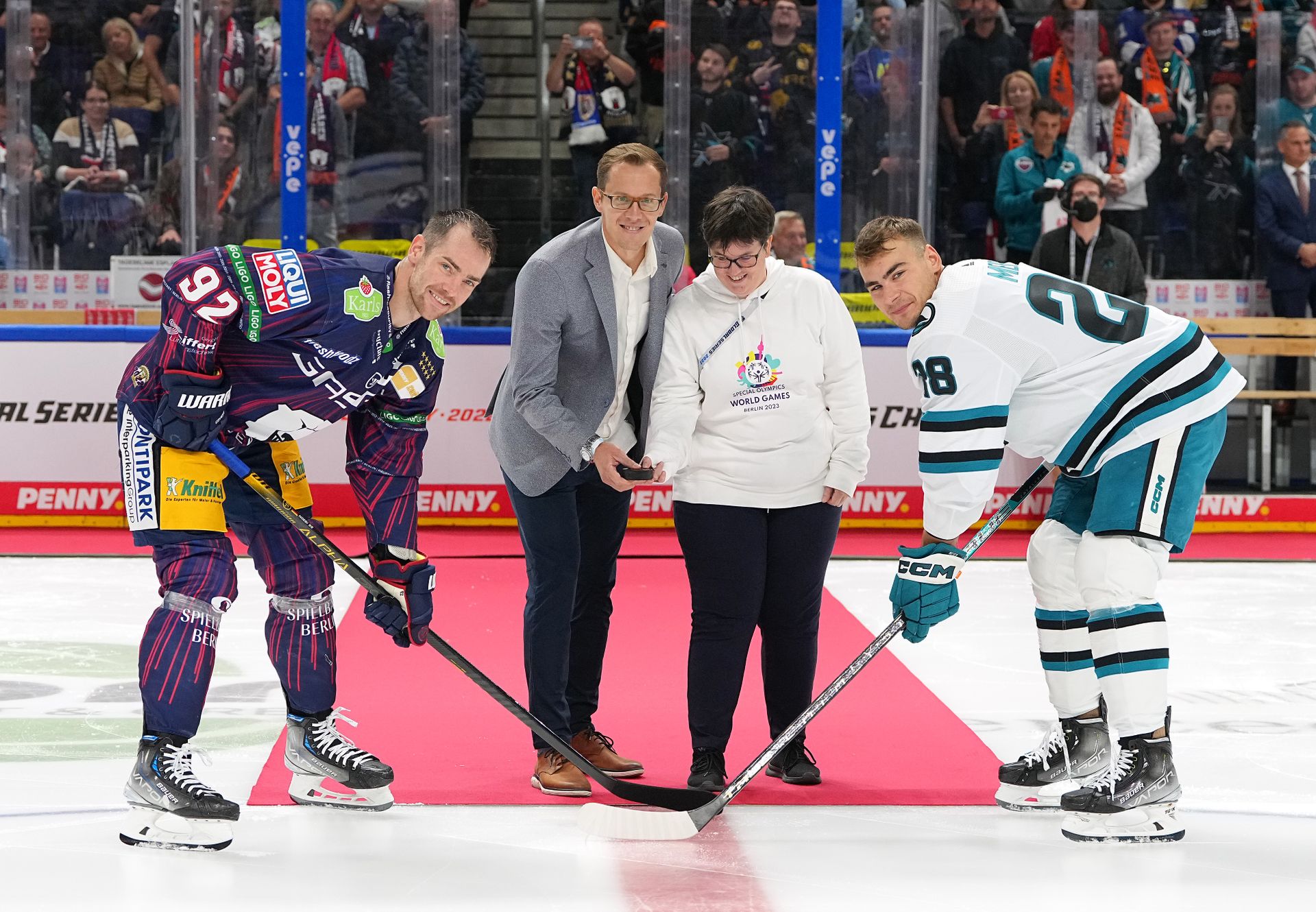 Zeremonieller Puck-drop vor dem Spiel Eisbären vs Sharks (v.l.n.r.): Marcel Noebels, Rob Zepp, Juliana Rößler und Timo Meier
