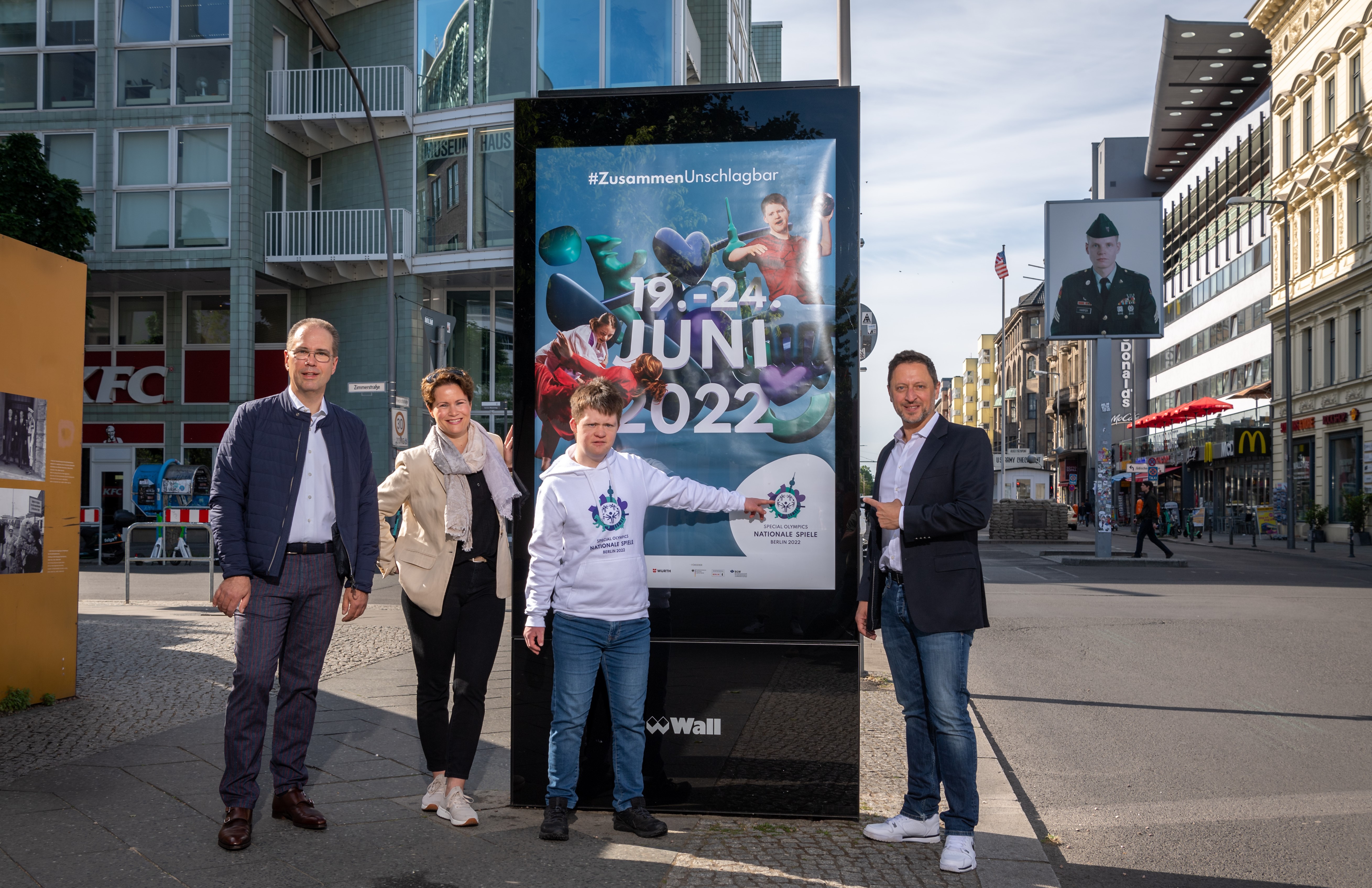Patrick Möller (Geschäftsführer Wall GmbH), Frauke Bank (Leiterin Corporate Communications & Affairs Wall GmbH), Arthur Hackenthal (Organisationskomitee der Special Olympics World Games Berlin 2023) und Albert Tuemann (CMO Special Olympics World Games Berlin 2023) positionieren sich an der Berliner Friedrichstraße Ecke Zimmerstraße zum Start der Eventkampagne der Special Olympics Nationalen Spiele Berlin 2022 vor einem der ersten gehängten Motive (v.l.n.r.)