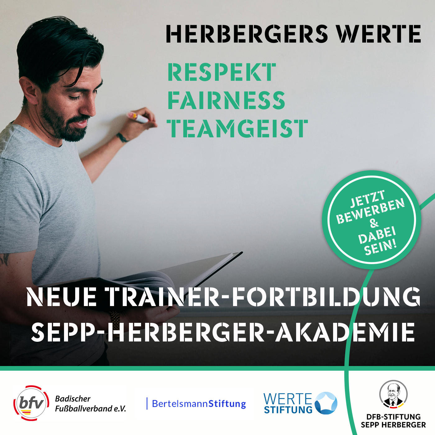 Alle Trainer*innen im Alter zwischen 18 und 40 Jahren, die im Badischen Fußballverband eine Nachwuchsmannschaft begleiten, können sich unter diesem Link bis zum Montag, 18. Oktober 2021, um die Teilnahme an der Sepp-Herberger-Akademie bewerben. Die Teilnehmerzahl ist auf 20 Plätze begrenzt. Bewerber*innen sollen über eine Fußballtrainerlizenz verfügen. Die Fortbildung wird im vollen Umfang zur Lizenzverlängerung angerechnet. Die Kosten für die Unterkunft, Verpflegung und das Programm werden durch die Veranstalter übernommen.