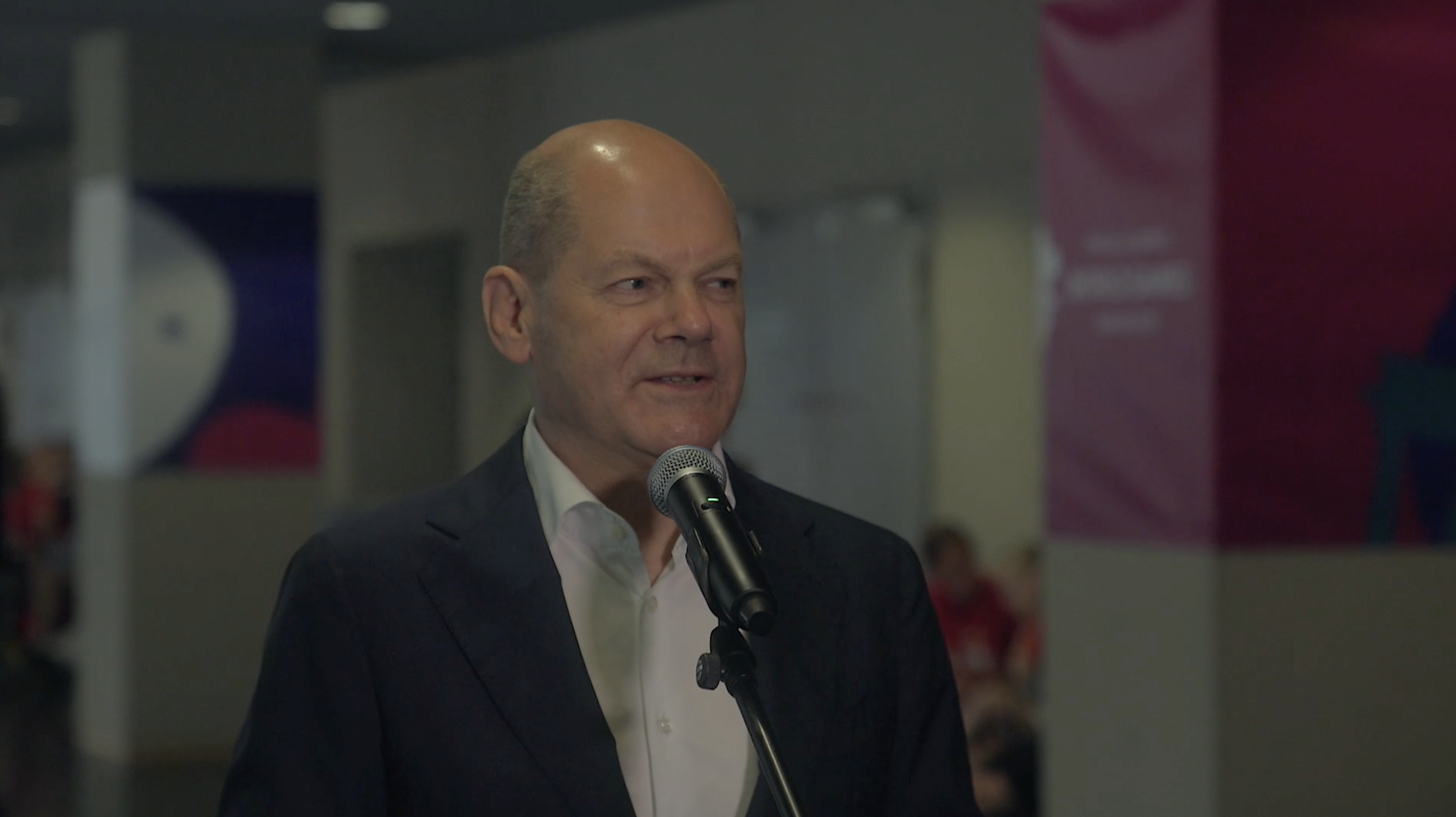 Statement von Bundeskanzler Olaf Scholz, der in Berlin nach einem Besuch bei einem Handball-Wettbewerb über die Bedeutung der Special Olympics World Games spricht.