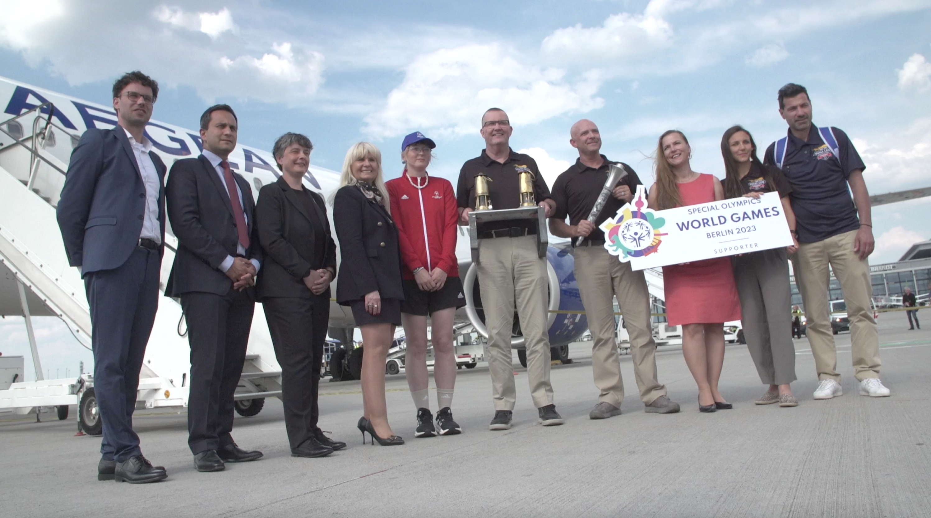 Berliner Sportsenatorin Iris Spranger empfing am Donnerstagnachmittag die Delegation um Athletin Natascha Wermelskirchen und den Geschäftsführer des Organisationskomitees der Weltspiele, Sven Albrecht, sowie die „Flame of Hope” am Flughafen Berlin Brandenburg.