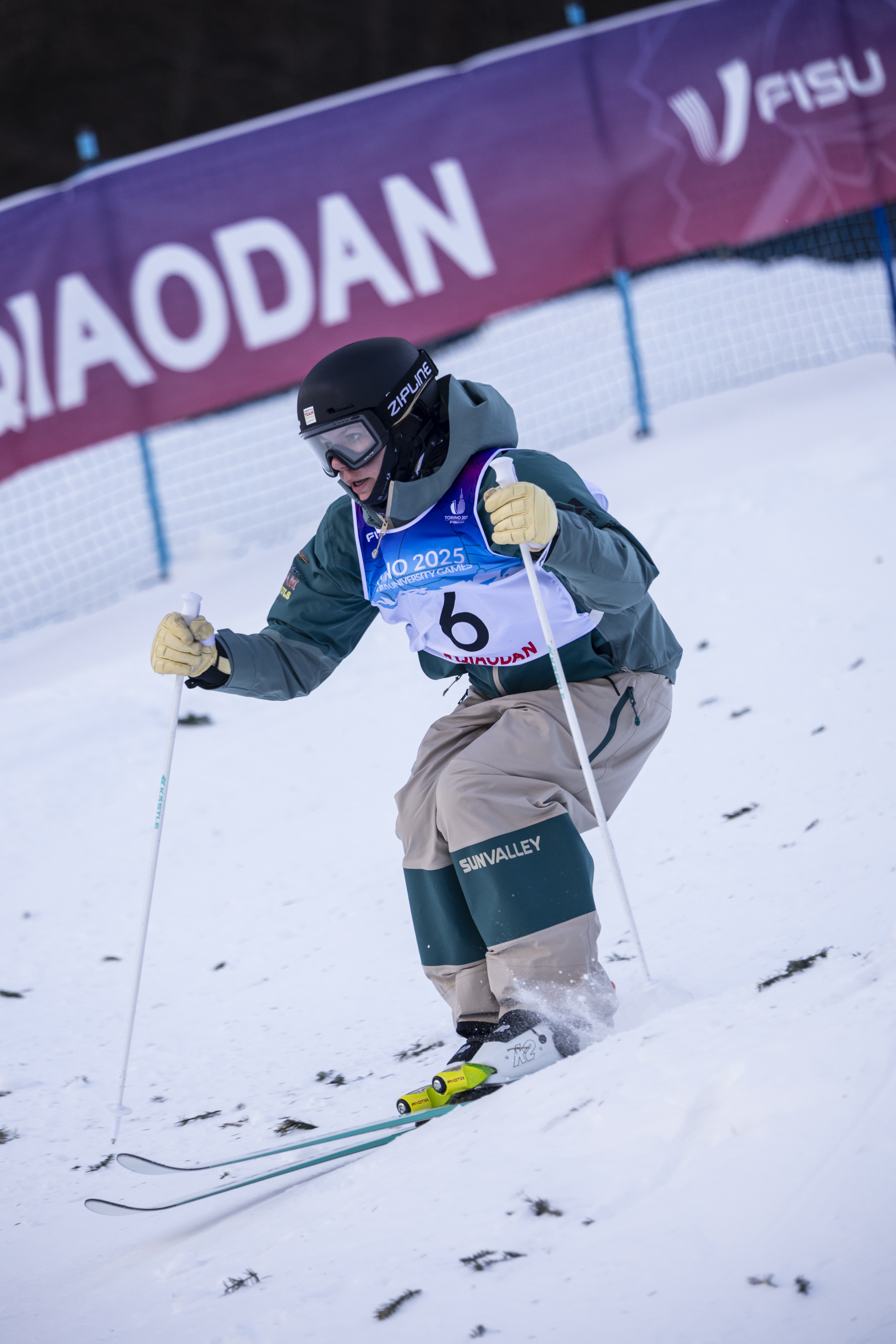 Gestern führte sie noch als Fahnenträgerin die deutsche Delegation ins Stadion, heute sorgte Hanna Weese (HS München) auf der Buckelpiste für das nächste Highlight. Mit ihrer Teamkollegin Annika Merz (Uni Konstanz) zog die 23-Jährige souverän ins Freestyle Ski Moguls Finale ein und wurde für die drittbeste Leistung mit Bronze belohnt. „Ich bin mega happy. Die Qualifikation hat schon sehr gut angefangen, aber ich wusste, dass ich da noch etwas draufsetzen kann. Das hat im Finale dann auch geklappt. Bei der Siegerehrung hat es sich super angefühlt, mit der Medaille um den Hals auf dem Podium zu stehen“, sagte Weese. Annika Merz verpasste mit Rang vier knapp das Podium.