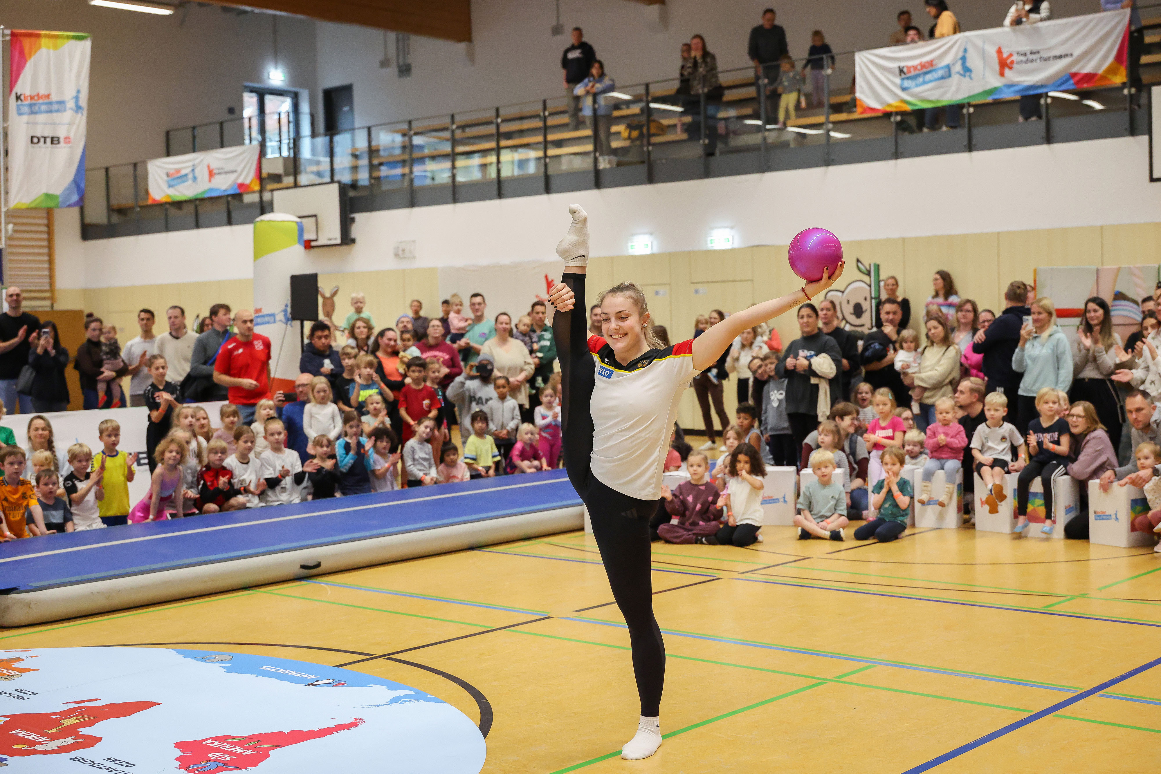 Mit einem abwechslungsreichen Programm, das viele Kinderaugen zum Strahlen brachte, präsentierte sich der Turn-Klub zu Hannover als hervorragender Gastgeber. Ein besonderes Highlight war der Besuch des Turn-Teams Deutschland, das die Kinder nicht nur mit spektakulären Darbietungen begeisterte, sondern auch spannende Tipps für sie hatte. Neben dem amtierenden Vize-Europameister am Reck und kinder Joy of Moving-Botschafter Andy Toba konnten sich die Kinder auf weitere Top-Stars freuen: die Europameisterin am Sprung 2025 Karina Schönmaier, die Olympia-Vierte Margarita Kolosov, der Europameister am Barren 2025 Nils Dunkel, der Europameister im Mixed Team 2025 Timo Eder sowie die Junioren-Weltmeisterin im Synchron-Trampolinturnen 2023 Maya Möller.
