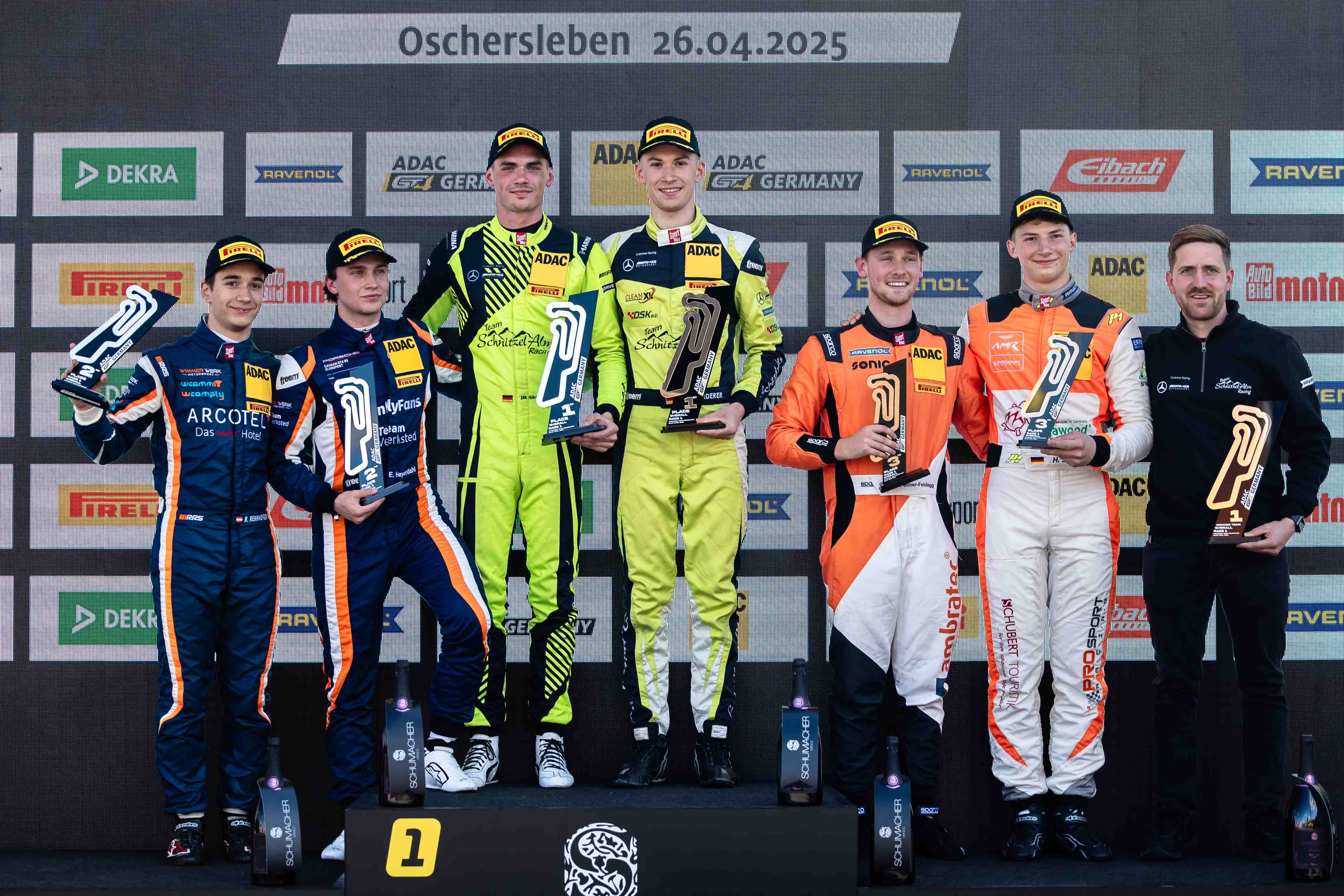 Perfekter Einstand für Enrico Förderer (18/Leuterod) und Jay Mo Härtling (22/Sprockhövel, beide SR Motorsport by Schnitzelalm): Das Mercedes-AMG GT4-Duo gewann den Saisonauftakt der ADAC GT4 Germany in der Motorsport Arena Oschersleben. Für beide Piloten war es das erste Rennen überhaupt in der Sportwagen-Serie des ADAC. Rang zwei ging nach einem sehenswerten Zweikampf an Raphael Rennhofer (18/AUT) und Emil Heyerdahl (22/NOR, beide Wimmer Werk Motorsport) im Porsche 718 Cayman GT4 vor Lokalmatador Hugo Sasse (21/Aschersleben) und Roman Fellner-Feldegg (22/Landsberg am Lech, beide Prosport Racing) im Aston Martin Vantage AMR GT4.