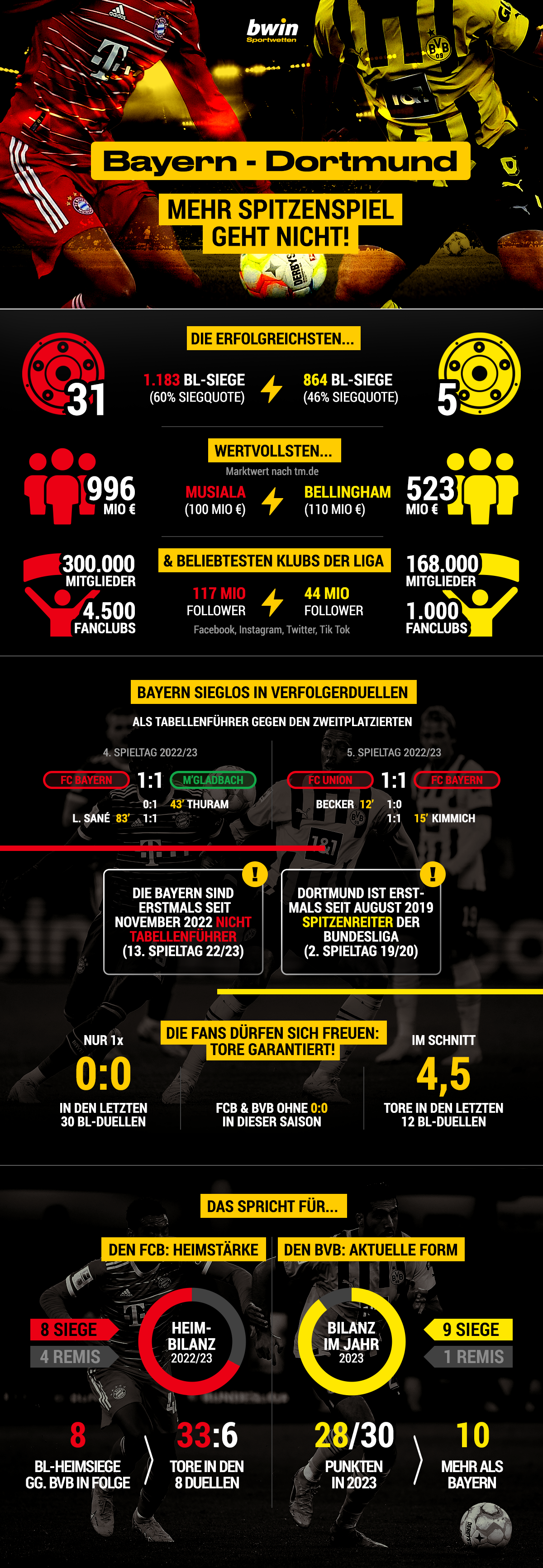 Sportwettenanbieter bwin glaubt nicht daran, dass Borussia Dortmund seine Tabellenführung in der Fußball-Bundesliga gegen den FC Bayern München verteidigt. Eine Woche nach dem Trainerbeben an der Säbener Straße geht der FC Bayern als klarer Favorit mit Sieg-Quote 1,47 in den „deutschen Clasico“ gegen den BVB.