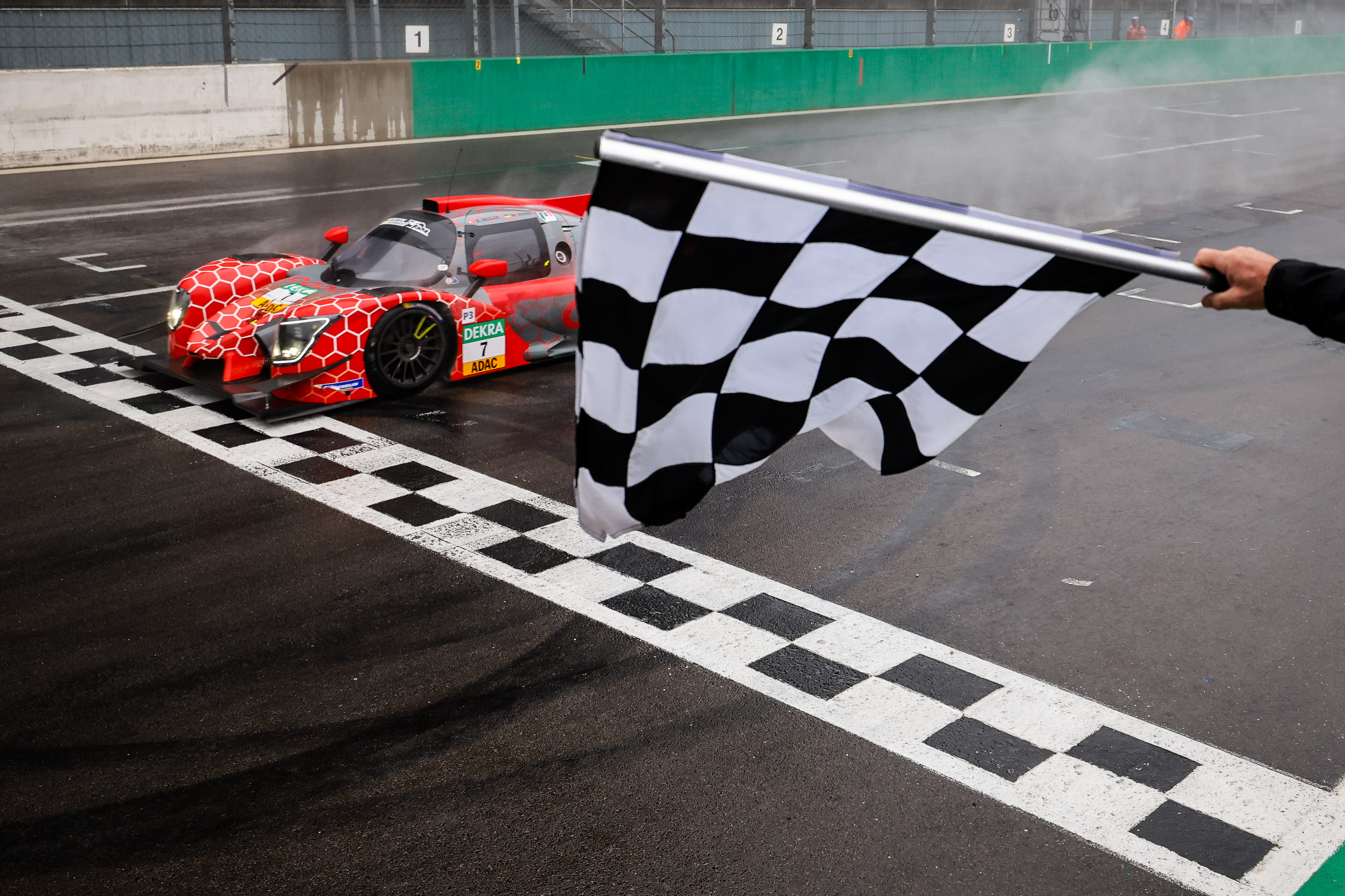 Der zweite Rennabschnitt war dann geprägt von Marvin Dienst. Zunächst überholte er Villagomez und übernahm somit die Führung. Mit weiterhin schnellen Rundenzeiten fuhr er daraufhin einen Vorsprung von über 33 Sekunden heraus und überquerte als Erster die Ziellinie. „Ich fuhr heute zum ersten Mal mit einem LMP3 im Regen“, so Dienst. „Da ich zuvor aber bereits das Rennen im ADAC GT Masters bei nassen Streckenbedingungen absolviert hatte, wusste ich ungefähr, an welchen Stellen ich besonders Vorsicht walten lassen musste. Das hat mir sicherlich ein wenig geholfen. Im Gegensatz zu einem freien Training konnte ich das Limit im Rennen aber nicht austesten. Doch nach und nach habe ich meinen Rhythmus gefunden und konnte immer schneller fahren.“ Neben dem Gesamtsieg freuten sich Besler/Dienst auch über den Erfolg in der Junior-Wertung.
