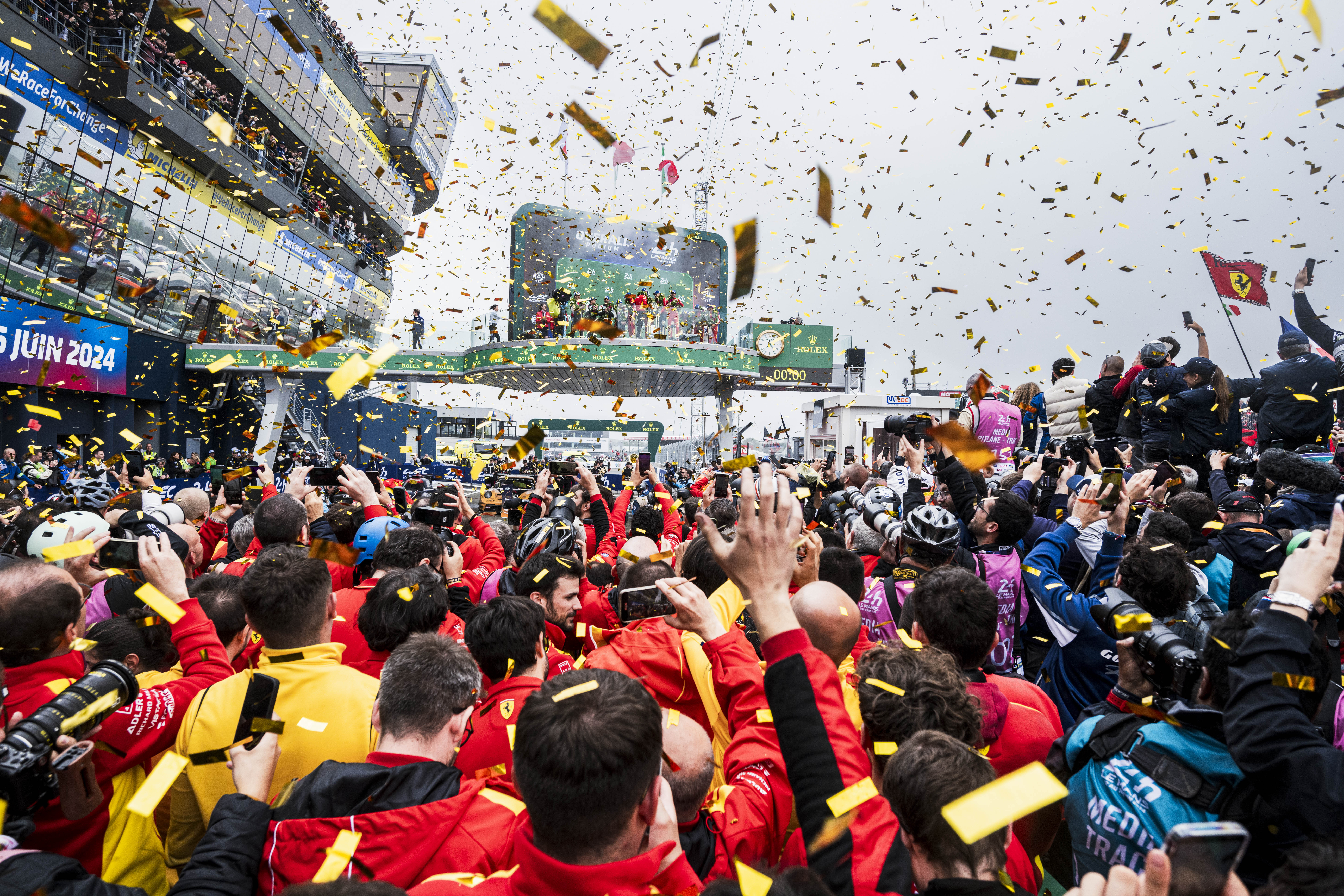 Der Ferrari AF Corse 499P Hypercar mit der Startnummer 50, pilotiert von Antonio Fuoco, Nicklas Nielsen und Miguel Molina, gewinnt das 24-Stunden-Rennen von Le Mans 2024, den vierten Lauf der FIA WEC, mit einem brillanten Sieg unter wechselhaften Bedingungen.