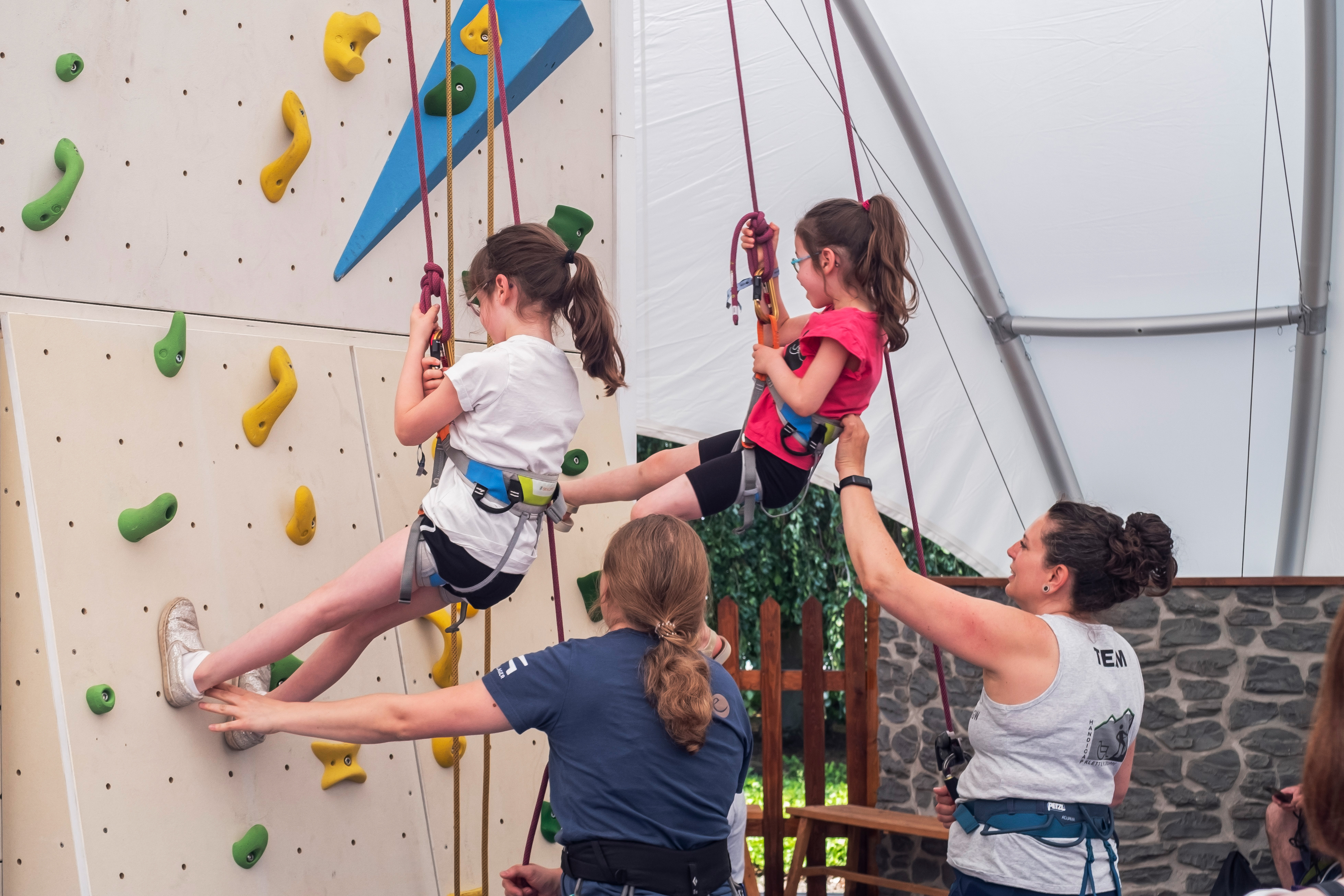 „Hier beim ´Pferde-Sport´ gibt es zwei Pferde aus Holz. Auf diese steigt man auf, und wer sich traut, versucht den Grundsitz und streckt die Arme zur Seite. Auch die ´Bank´, die ´Fahne´ oder die ´Mühle´ werden ausprobiert“, erklärt Volontärin Lana Stengel. „Wir haben viele Familien hier und auch Erwachsene machen mit. Es geht ums Gleichgewicht und wir geben natürlich bei Bedarf Hilfestellung. Jeder macht es so, wie er es kann“, sagt die 24-Jährige.