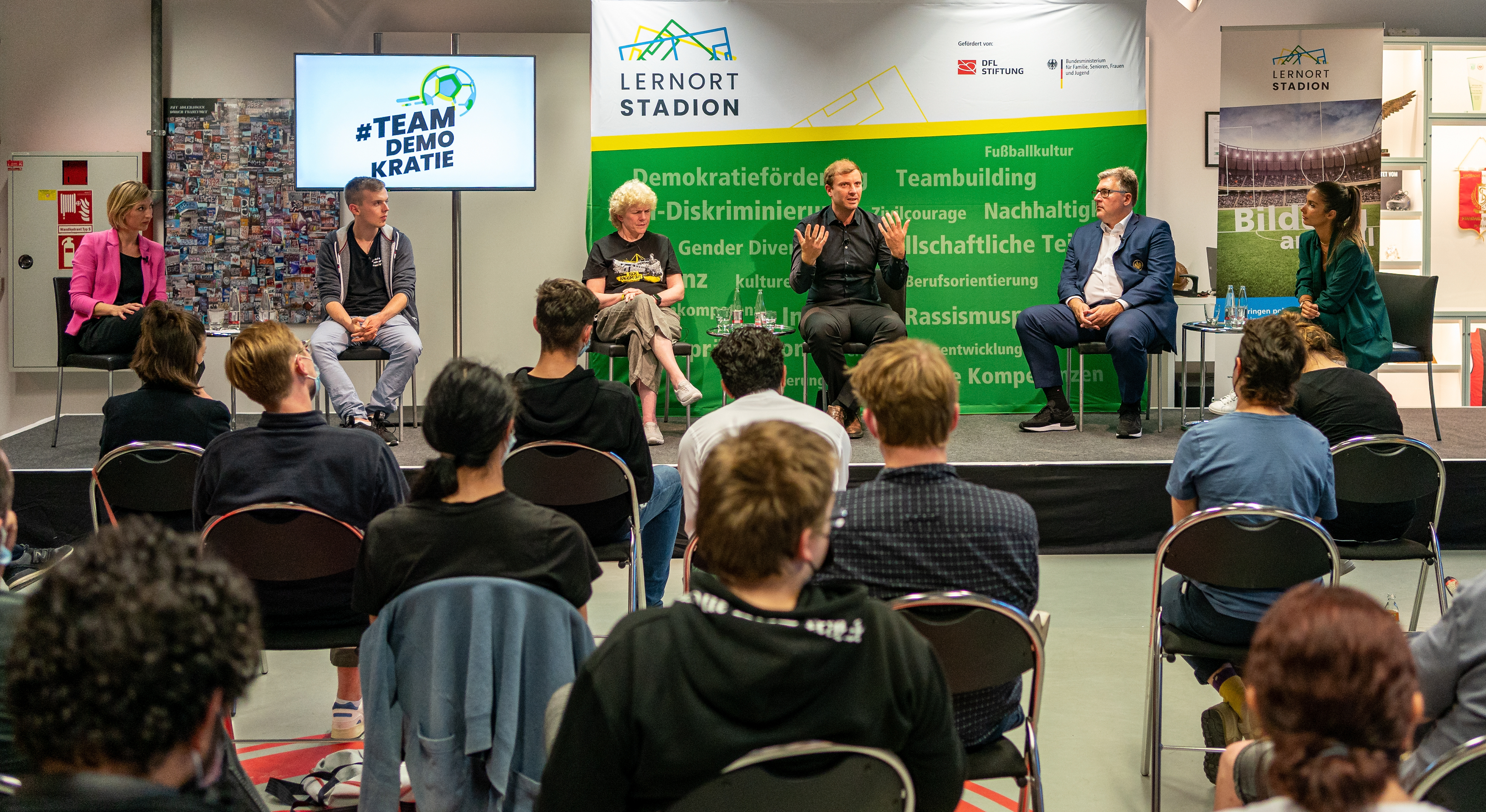 Den Auftakt von #TeamDemokratie bildete am gestrigen Abend eine Podiumsdiskussion im Eintracht Frankfurt Museum, einem von 23 Standorten von „Lernort Stadion“. Söhnke Vosgerau, Vorstandsvorsitzender vom Lernort Stadion e.V., erklärte: „Gerade im Kontext der Corona-Pandemie ist es uns wichtig, Jugendliche dazu zu ermutigen, eine eigene demokratische Haltung zu entwickeln und sich aktiv in der Gesellschaft einzubringen. Mit der Initiative #TeamDemokratie wollen wir ein Zeichen setzen und junge Menschen mit der Strahlkraft des Fußballs für demokratische Werte und Teilhabe begeistern und ihnen ein Sprachrohr für ihre Anliegen bieten.“