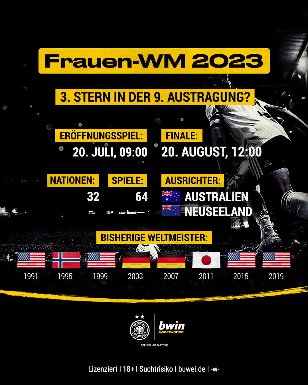 Für Sportwettenanbieter bwin gehört Deutschland trotz zuletzt eher durchwachsener Leistungen zum engen Favoritenkreis auf den Titel bei der Frauen-Fußball-WM 2023 (20. Juli bis 20. August) in Australien und Neuseeland.