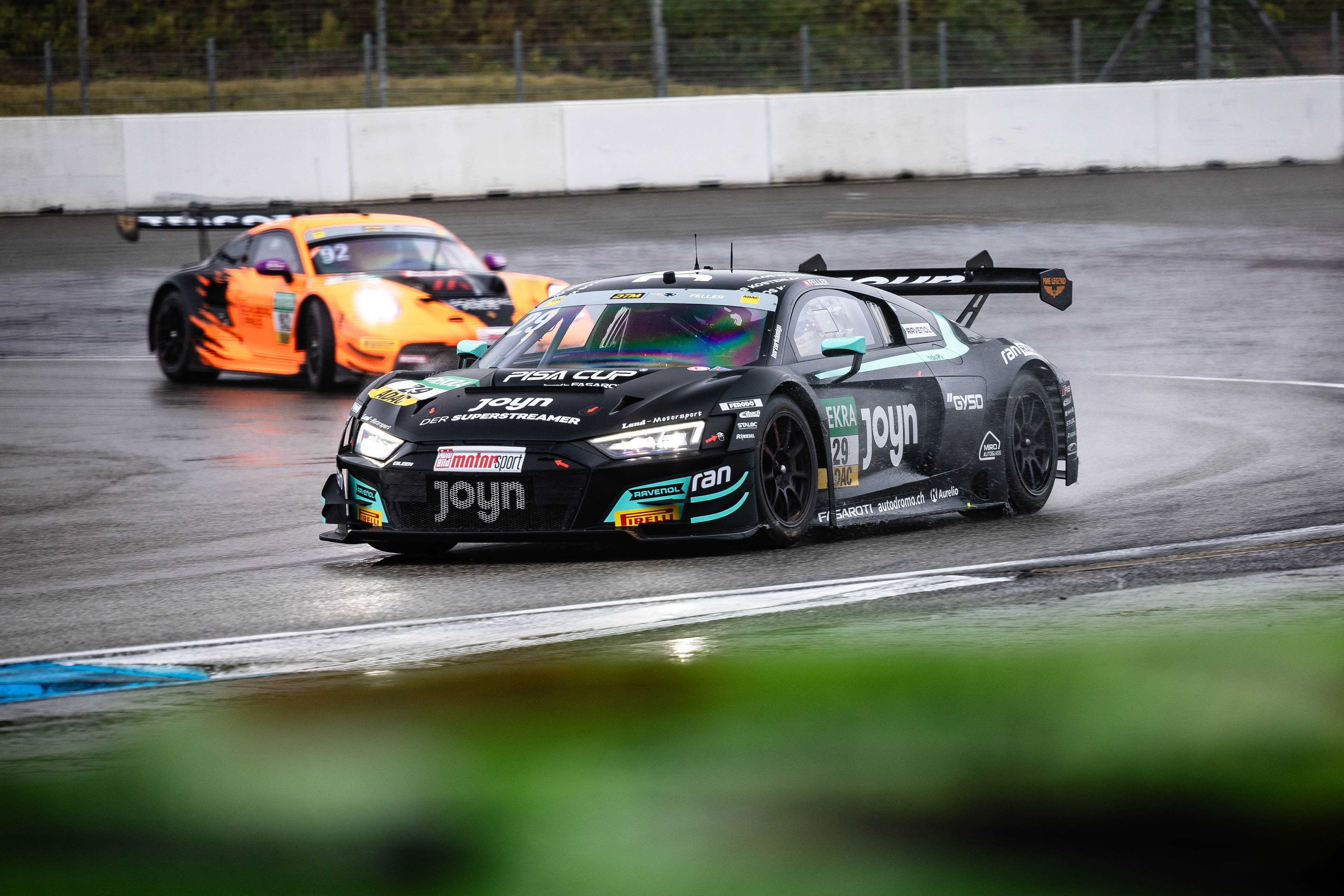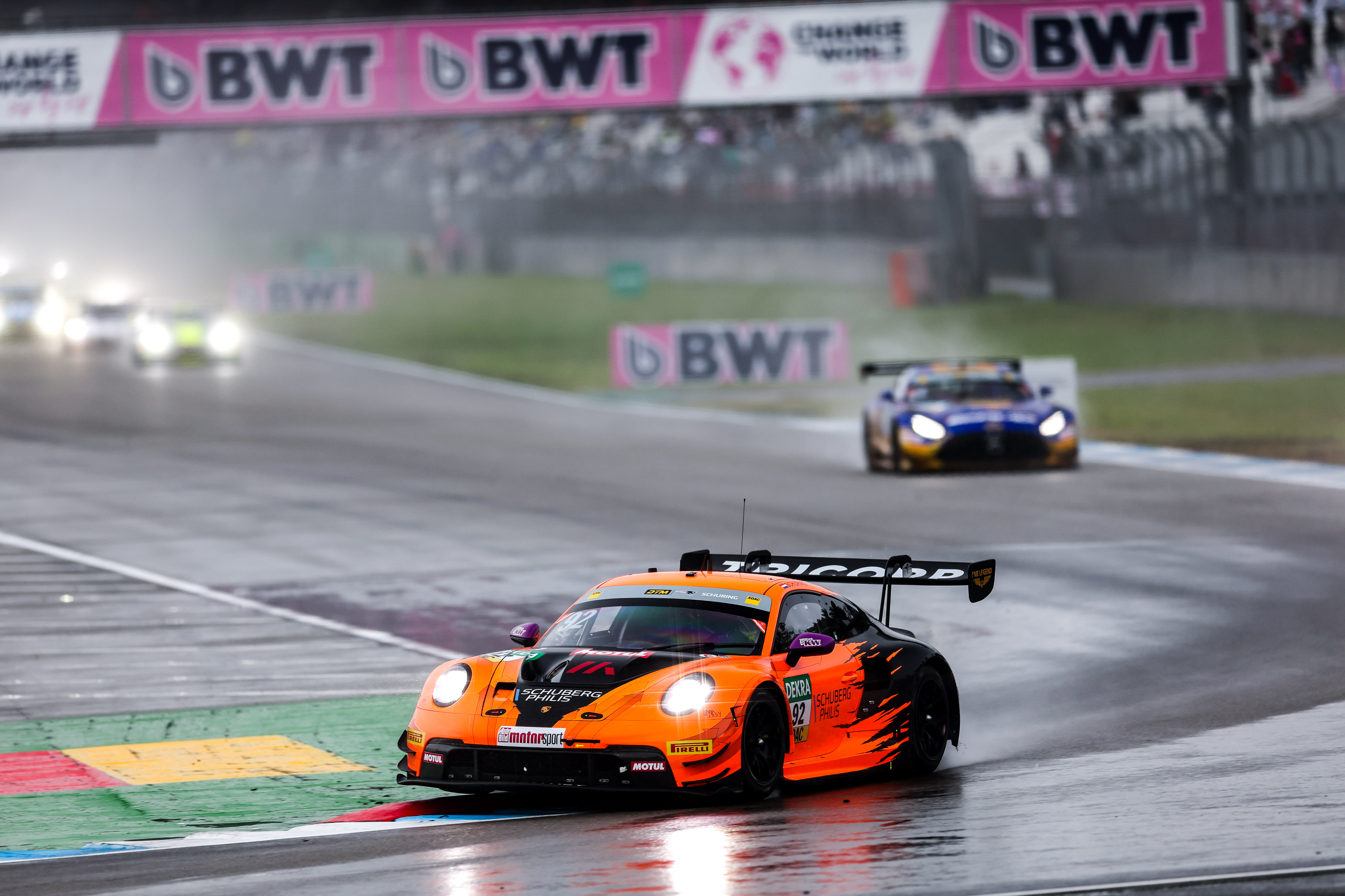 Beim Start zum vorletzten Meisterschaftslauf auf dem Hockenheimring sorgte starker Regen für schwierige Bedingungen. Schon im ersten Umlauf verlor Pole-Setter Ben Green (GB/Emil Frey Racing) nach einem Verbremser die Führung an seinen Teamkollegen Jack Aitken (GB) und musste kurze Zeit später auch Preining vorbeiziehen lassen. Der Österreicher spielte danach auf nasser Fahrbahn seine Stärken und die seines Neunelfers voll aus, übernahm nach einem gekonnten Überholmanöver in Umlauf acht die Führung und setzte sich mit schnellen Rundenzeiten von der Konkurrenz ab. Auch Feller und Schuring gingen an Green vorbei, der immer weiter zurückfiel. Unglücklich verlief das Rennen auch für Jordan Pepper (ZA/TGI Team Lamborghini by GRT): Der Lamborghini-Pilot schied nach einer Berührung mit einem anderen Fahrzeug bereits in der vierten Runde aus, bleibt als Tabellensechster aber im Kreis der Titelkandidaten.