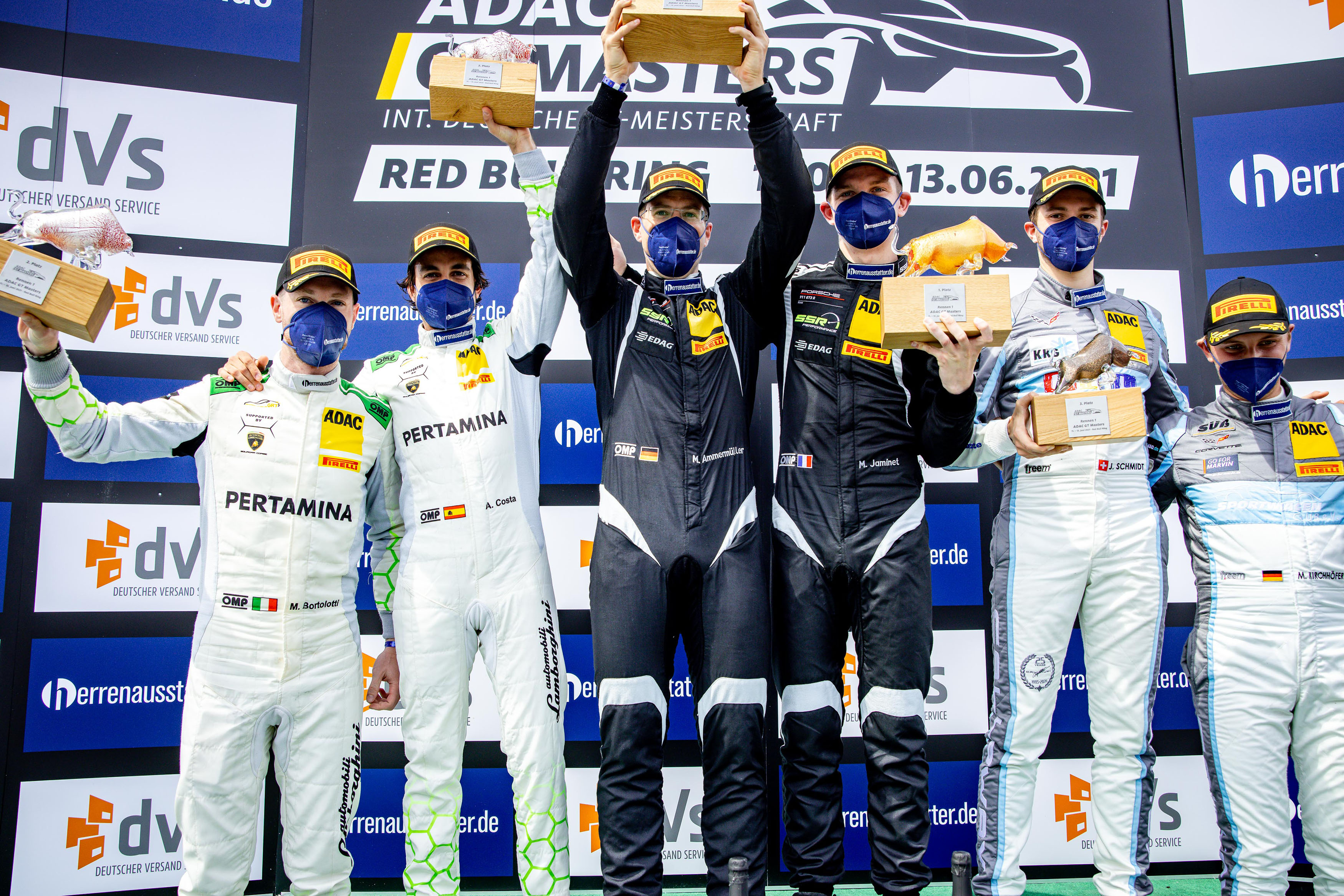 Spannend verlief auch der Kampf um Platz zwei. Dieser ging am Ende mit 1,1 Sekunden Rückstand an das Lamborghini-Duo Mirko Bortolotti/Albert Costa Balboa. Bortolotti hatte im Qualifying die Bestzeit erobert, musste aber wegen eines Vergehens seines Teamkollegen in Oschersleben von Startplatz sechs ins Rennen gehen. Der Italiener kämpfte sich in der ersten Rennhälfte bis auf Rang vier, ehe Costa Balboa in seinem Stint auf Position zwei vorfuhr und damit dem GRT Grasser Racing Team beim Heimspiel ein Podium schenkte. Ihren ersten Podestplatz der Saison holten als Dritte die Corvette-Fahrer Jeffrey Schmidt und Marvin Kirchhöfer. Kirchhöfer lieferte sich in der Schlussphase einen engen Kampf mit Maximilian Buhk. Er musste diesen zwischenzeitlich auf Anweisung der Rennleitung wegen Missachtens der Streckenbegrenzung wieder vorbeilassen, holte sich den letzten Podiumsplatz aber umgehend wieder zurück. Marciello und Buhk mussten sich am Ende mit Platz vier zufriedengeben.