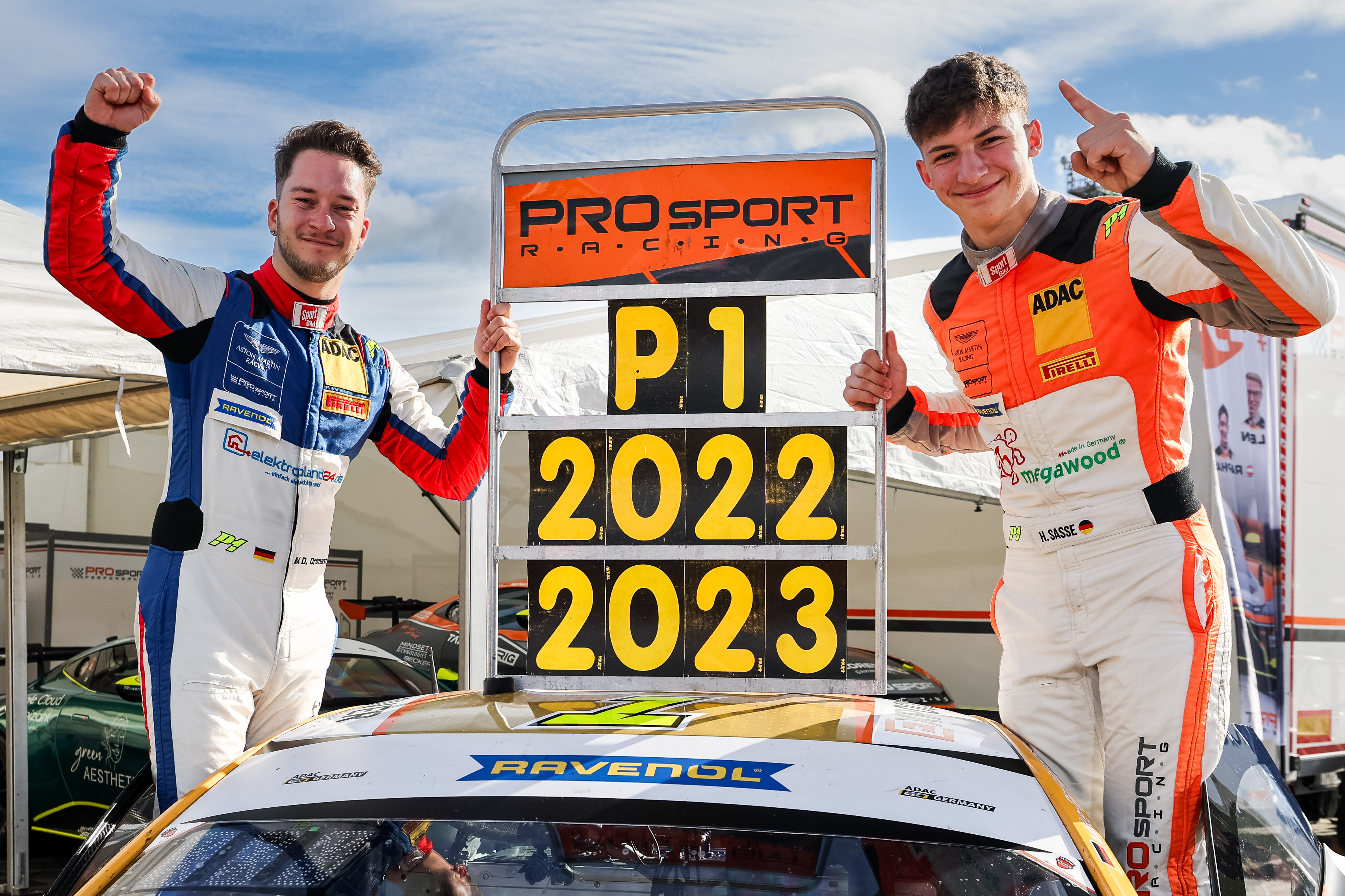 Hugo Sasse (19/Aschersleben) und Mike David Ortmann (23/Ahrensfelde, beide Prosport Racing) haben es geschafft. Das Aston Martin Vantage GT4-Duo krönte sich mit einem sechsten Platz im Samstagsrennen auf dem Hockenheimring vorzeitig zum Champion der Saison 2023 in der ADAC GT4 Germany. Sasse/Ortmann hatten bereits 2022 den Titel eingefahren. Ihnen gelang somit ein Novum. Denn noch nie zuvor konnte der Fahrer-Titel in der ADAC GT4 Germany verteidigt werden. „Dieser Erfolg fühlt sich einfach nur schön an. Die ersten Titelverteidiger der ADAC GT4 Germany stellen zu können, ist etwas ganz Besonderes für unser Team. Hugo ist immer relaxt – Mike hingegen eher emotional. Zusammen ergänzen sie sich perfekt. Sie sind verdient Champion geworden“, jubelte Teamchef Christoph Esser über die gelungene Titelverteidigung von Sasse/Ortmann.
