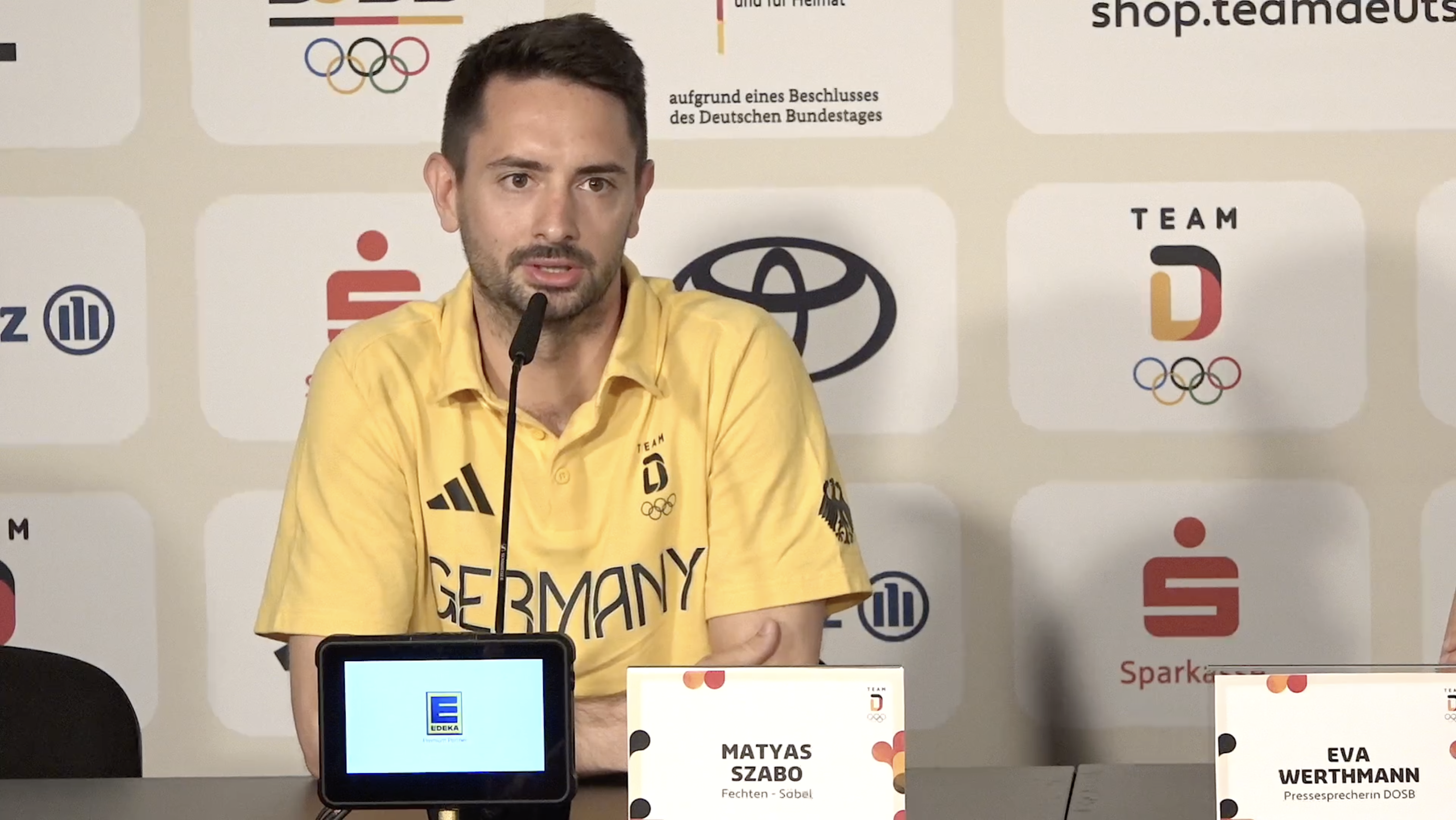 Im Rahmen einer Pressekonferenz im Deutschen Haus spricht Säbelfechter Matyas Szabo u.a. über die Entscheidungen des Schiedsrichters während seines Wettkampfes und darüber, wie er die Stimmung in Paris wahrnimmt.