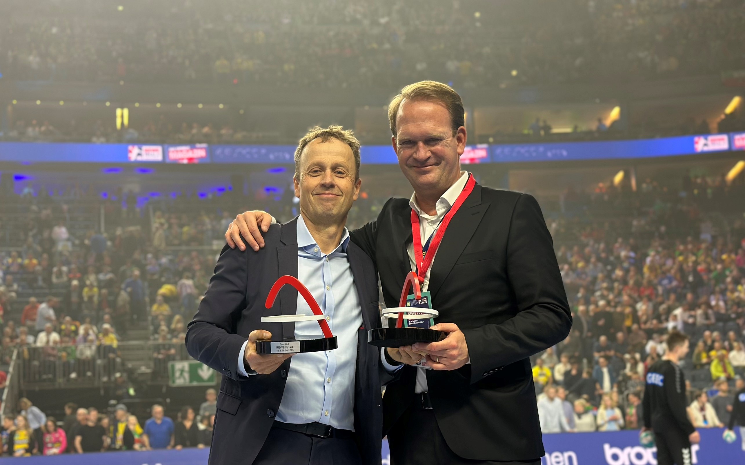 Im Vorfeld der Finalpartie zwischen dem SC Magdeburg und den Rhein-Neckar Löwen überreichte Arena-Geschäftsführer Stefan Löcher der veranstaltenden LIQUI MOLY Handball-Bundesliga, in Person von Geschäftsführer Frank Bohmann, den Premieren-Award der LANXESS arena. Doch damit nicht genug: Angesichts der gigantischen Ticket-Nachfrage gab es zudem den Sold-Out-Award, wodurch die rundum erfolgreiche Veranstaltung entsprechend gewürdigt wurde.