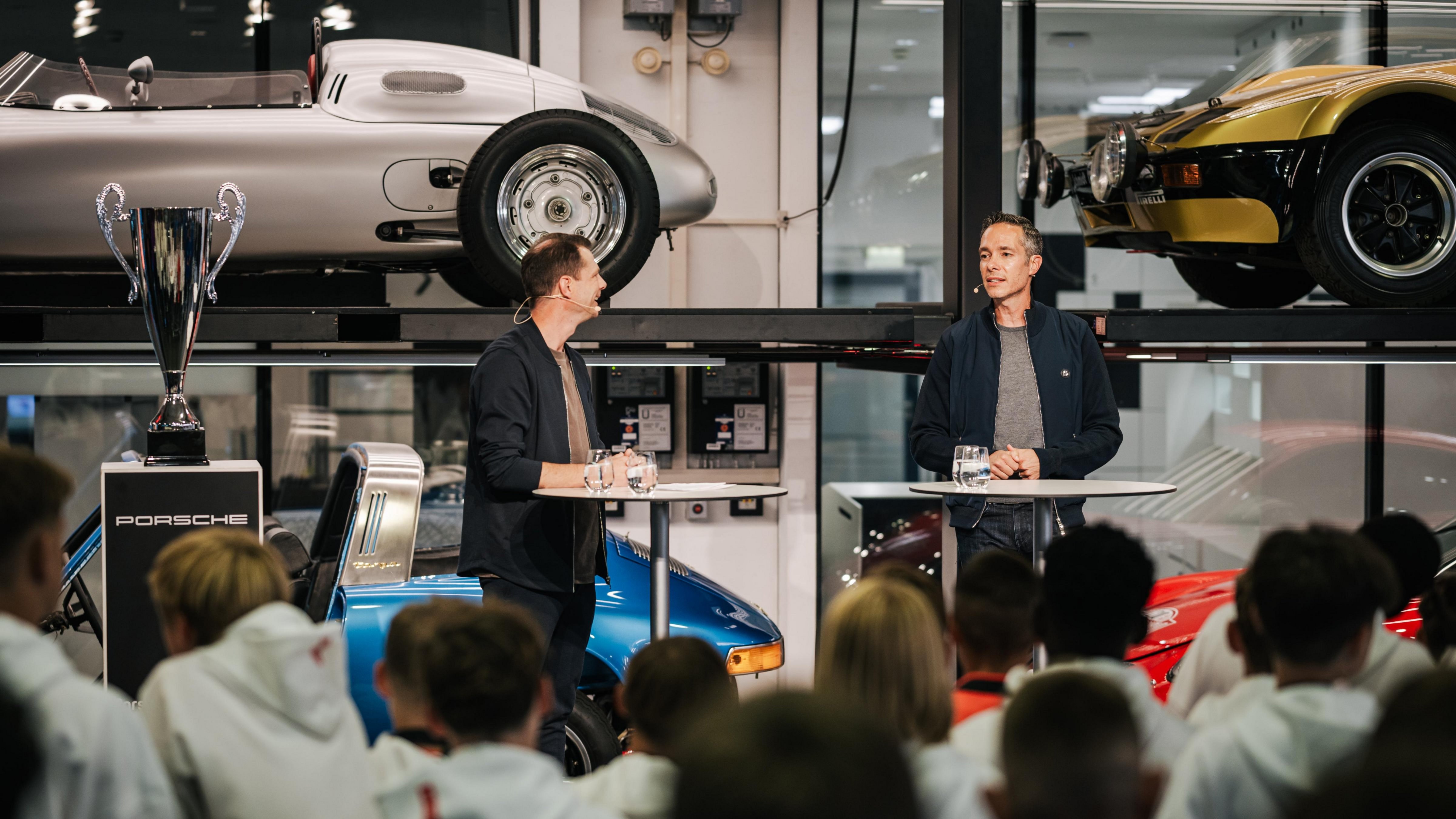 Dr. Sebastian Rudolph nahm die offizielle Begrüßung zum Porsche Fußball Cup im Porsche Museum vor. In einem gemeinsamen Talk gaben Sami Khedira und VfB-Legende Timo Hildebrand spannende Einblicke ins Leben eines Fußball-Profis. „Wir freuen uns auf starke sportliche Leistungen und darauf, euch anzufeuern“, sagte Khedira. Den jungen Spielern gab er zudem Folgendes mit auf den Weg: „Im Norden wird anderer Fußball gespielt als im Süden. Nutzt das Turnier also auch zum Austausch.“