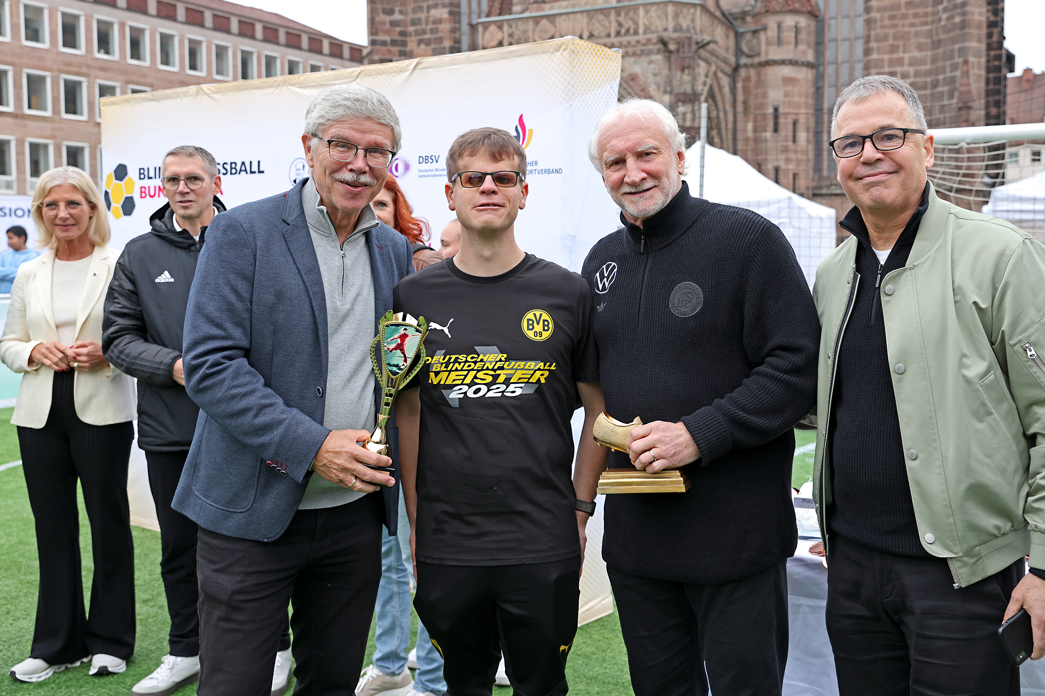 Eine besondere Freude für die Spielerinnen und Spieler der Blindenfußball-Bundesliga war Besuch von DFB-Sportdirektor Rudi Völler und DFB-Geschäftsführer Andreas Rettig, die zusammen mit DFB-Vizepräsident Ralph-Uwe Schaffert, dem Vorsitzenden der DFB-Stiftung Sepp Herberger, sowie Stiftungskuratorin Monica Lierhaus, die Siegerehrung durchführten.