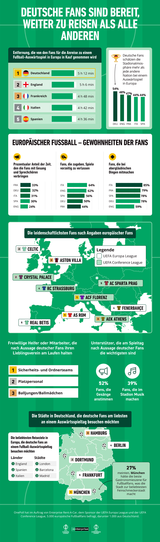 Das Umfrageportal OnePoll hat im Auftrag von Enterprise Rent-A-Car, dem Sponsor der UEFA Europa League und der UEFA Conference League, eine neue Umfrage über Fankulturen in Europa durchgeführt. Diese ergibt unter anderem, dass deutsche Fußballfans bereit sind, im Schnitt mehr als viereinhalb Stunden zu reisen, um ihre Mannschaft anzufeuern. Jeder Vierte der Befragten ist sogar bereit, eine Reise von sieben Stunden oder mehr auf sich zu nehmen, um 90 Minuten Action zu sehen.