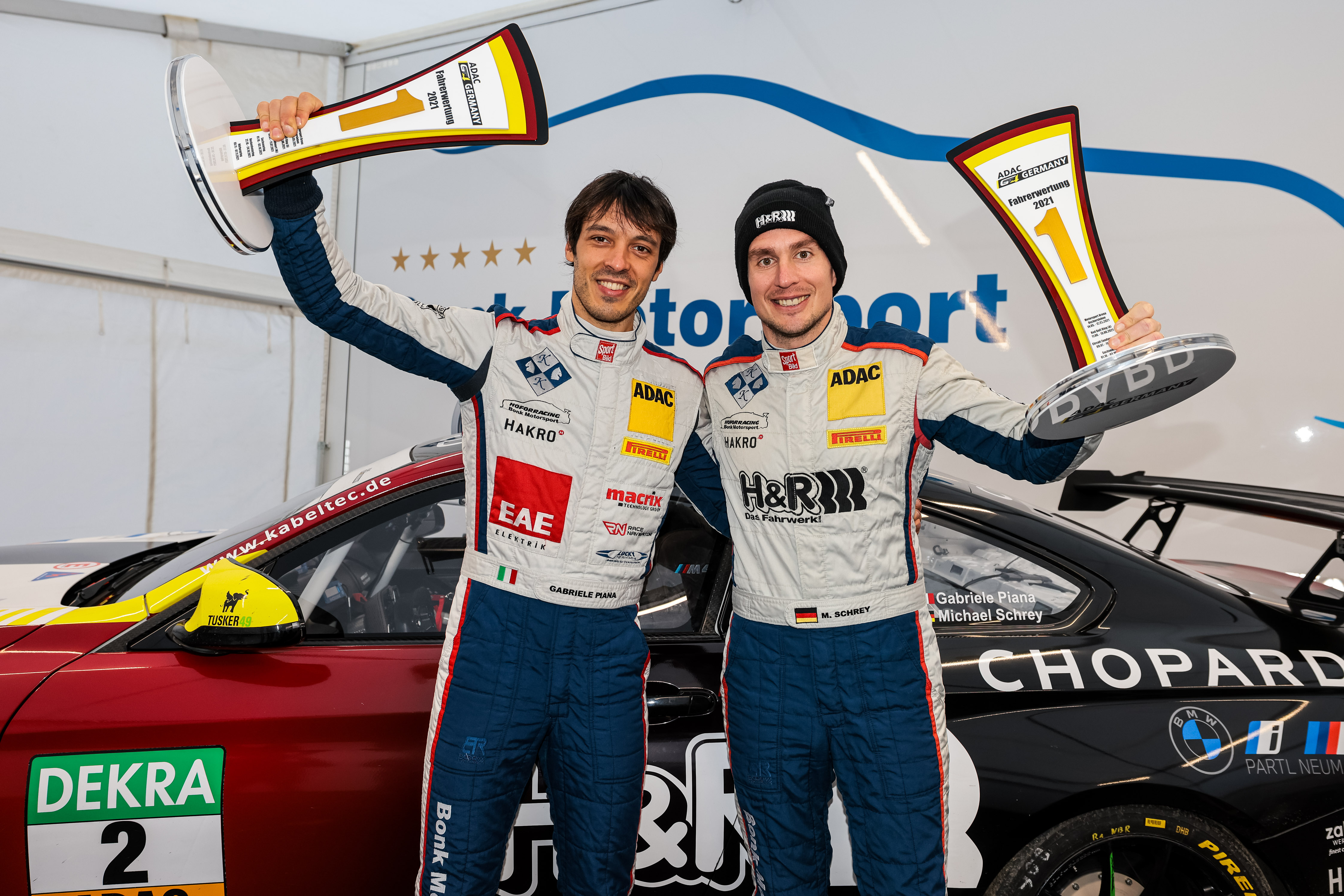 Reifenpoker um den Titel und packende Duelle um den Rennsieg: Das Sonntagsrennen der ADAC GT4 Germany auf dem Nürburgring bot allerbesten Sport und eine spannende Titelentscheidung. Michael Schrey (38/Wallenhorst) und Gabriele Piana (35/ITA, beide Hofor Racing by Bonk Motorsport) kamen im BMW M4 GT4 auf Platz 20 ins Ziel, konnten sich jedoch über den Titel in der Fahrer-Meisterschaft freuen. „Das ist der größte Triumph in meiner Karriere. Michael und ich haben die ganze Saison wirklich hart gearbeitet. Mich freut es vor allem für unser Team Hofor Racing by Bonk Motorsport. Auch sie haben diesen Titel verdient“, jubelte Piana bei der Meisterfeier. Der Sieg im letzten Rennen ging wie bereits am Samstag an Hugo Sasse (17/Aschersleben) und Mike David Ortmann (22/Ahrensfelde, beide Prosport Racing) im Aston Martin Vantage GT4. Rang zwei ging an das Porsche 718 Cayman-Duo Nicolaj Møller Madsen (28/DNK) und Lukas Schreier (26/Leipzig, beide W&S Motorsport) vor deren Markenkollegen Joel Sturm (19/Brühl) und Paul-Aurel König (17/Hameln, beide Team Allied-Racing).