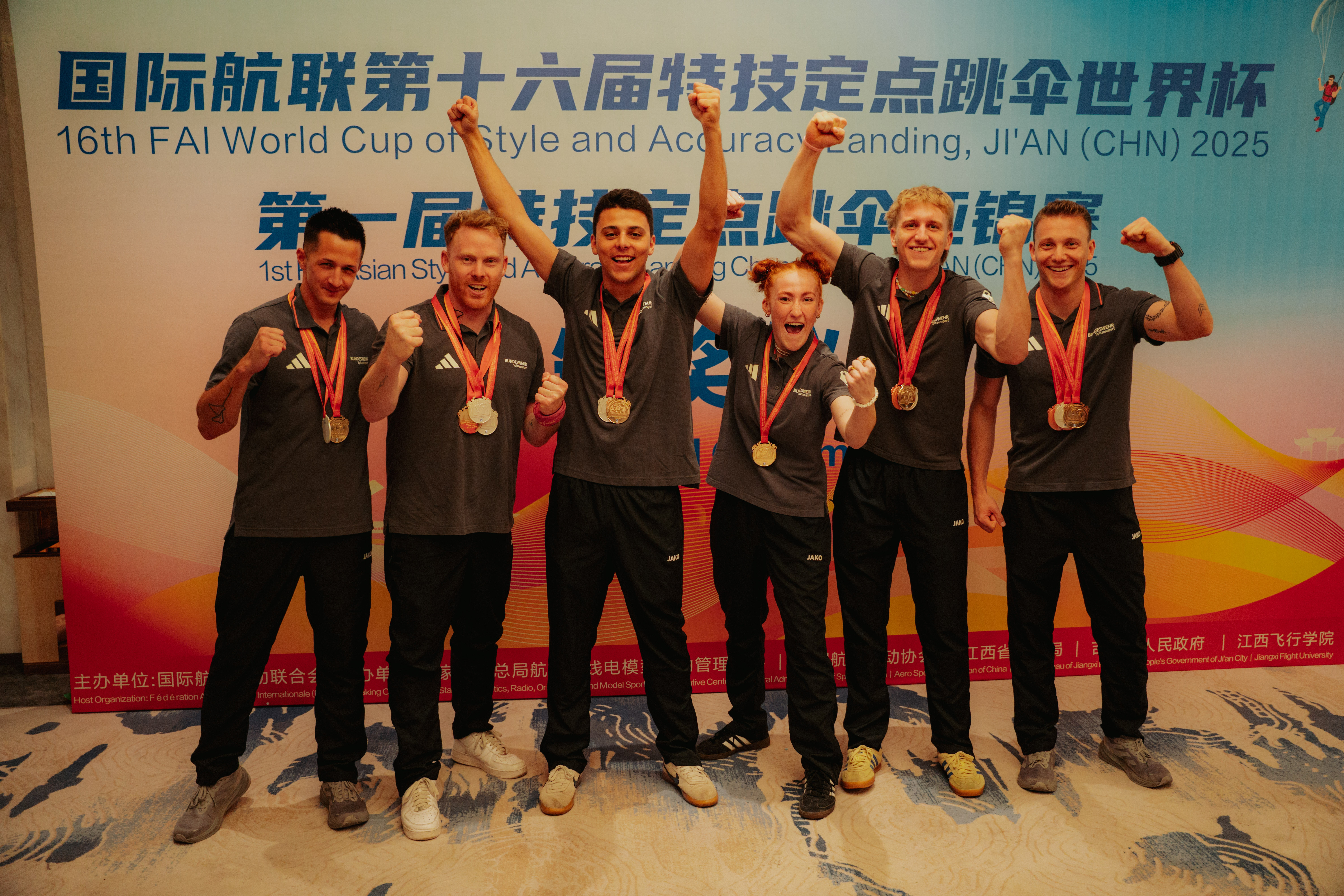 Jiangxi, China, 02. November 2025 (dfv) - Die Aktiven des Deutschen Fallschirmsportverbandes (DFV) und des deutschen Aero Clubs (DAeC) können nach einer erfolgreichen Weltcupwoche im Stil- und Zielspringen im chinesischen Jiangxi mehr als zufrieden die Heimreise antreten. Mit insgesamt sieben Medaillen im Gepäck - zwei Gold-, zwei Silber- und drei Bronzemedaillen sowie einem Europarekord - stellten die deutschen „Klassiker“ einmal mehr ihre Weltklasse unter Beweis. „Für die Militärweltmeisterschaften in zwei Wochen in Kartar ist das Team bestens vorbereitet und erneut einer der Favoriten auf die Medaillen“, sagte Bundestrainer Torsten Kunke (Halle an der Saale).