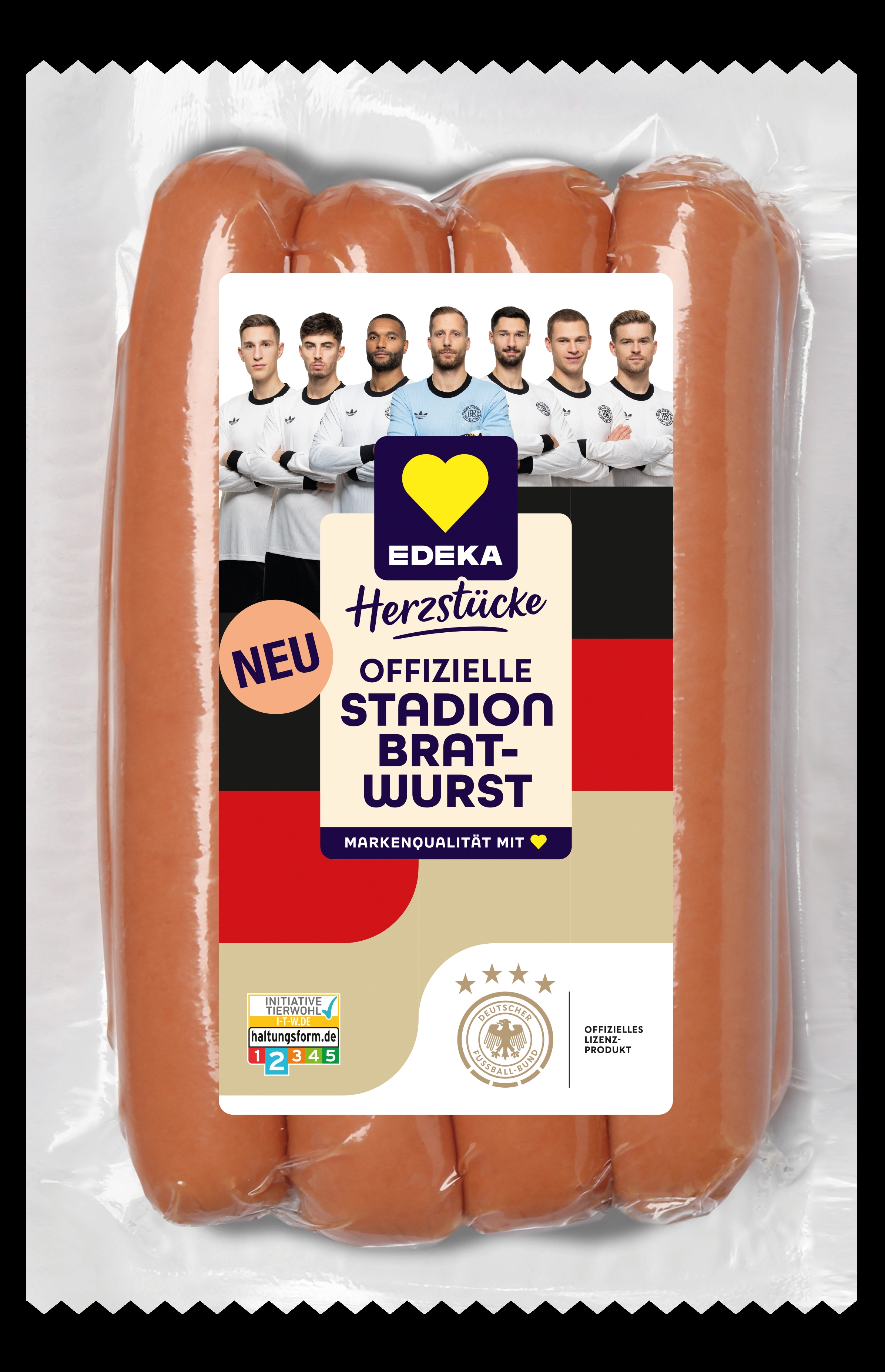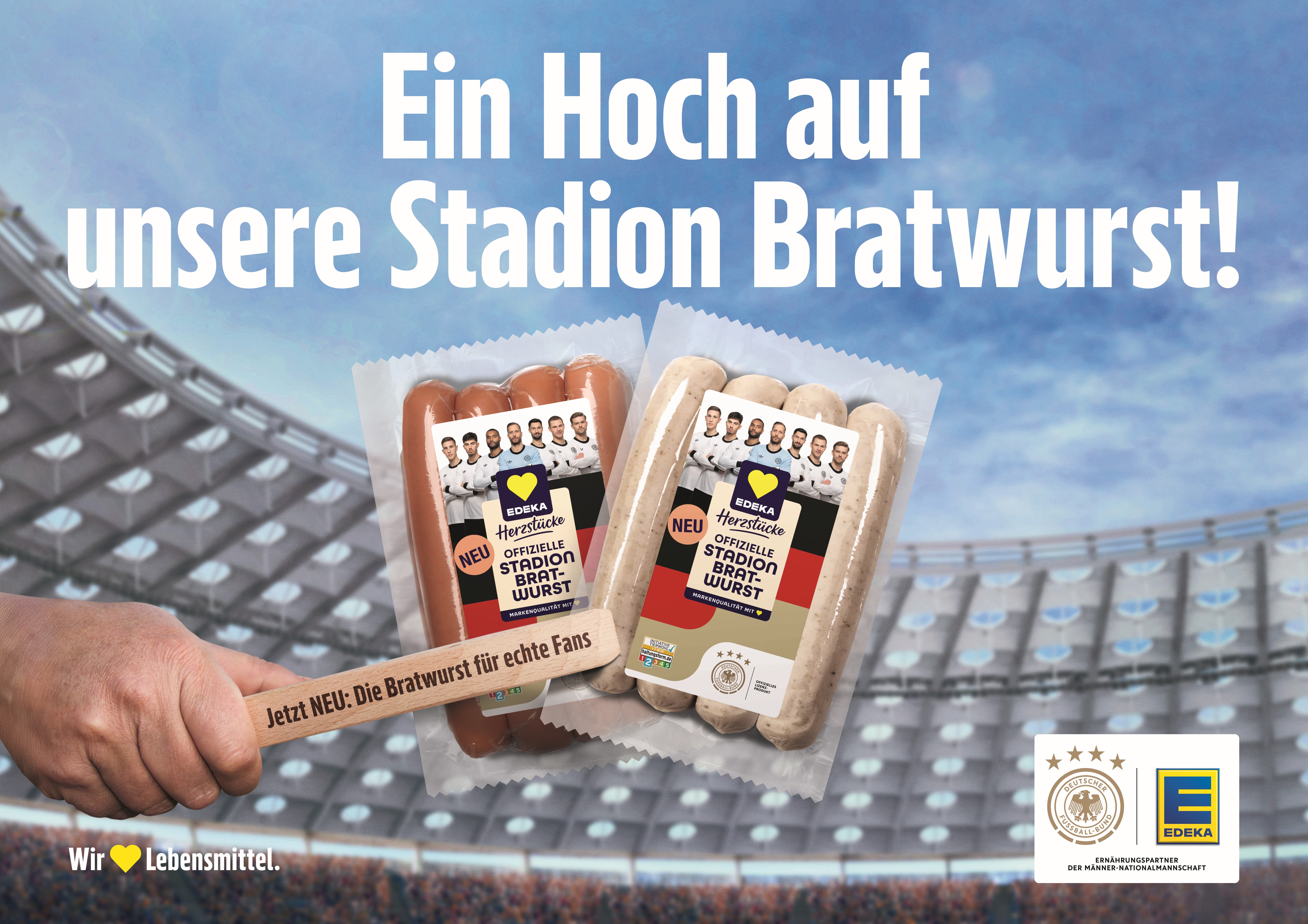 Seit April ist EDEKA offizieller Ernährungspartner der Männer-Nationalmannschaft des Deutschen Fußball-Bundes (DFB). Zum Start der Partnerschaft bringen EDEKA und der DFB das Stadionfeeling direkt in die heimische Küche – oder auf den Grill: Pünktlich zur Grill-Saison und dem Länderspiel mit Beteiligung der deutschen Männer-Nationalmannschaft in München ist die „EDEKA Herzstücke Offizielle Stadion Bratwurst“ in zwei Sorten ab sofort in teilnehmenden EDEKA-Märkten erhältlich. Aktivierende Maßnahmen in den Märkten, online oder in verschiedenen Austragungsstätten begleiten den Launch des neuen Lizenzprodukts.