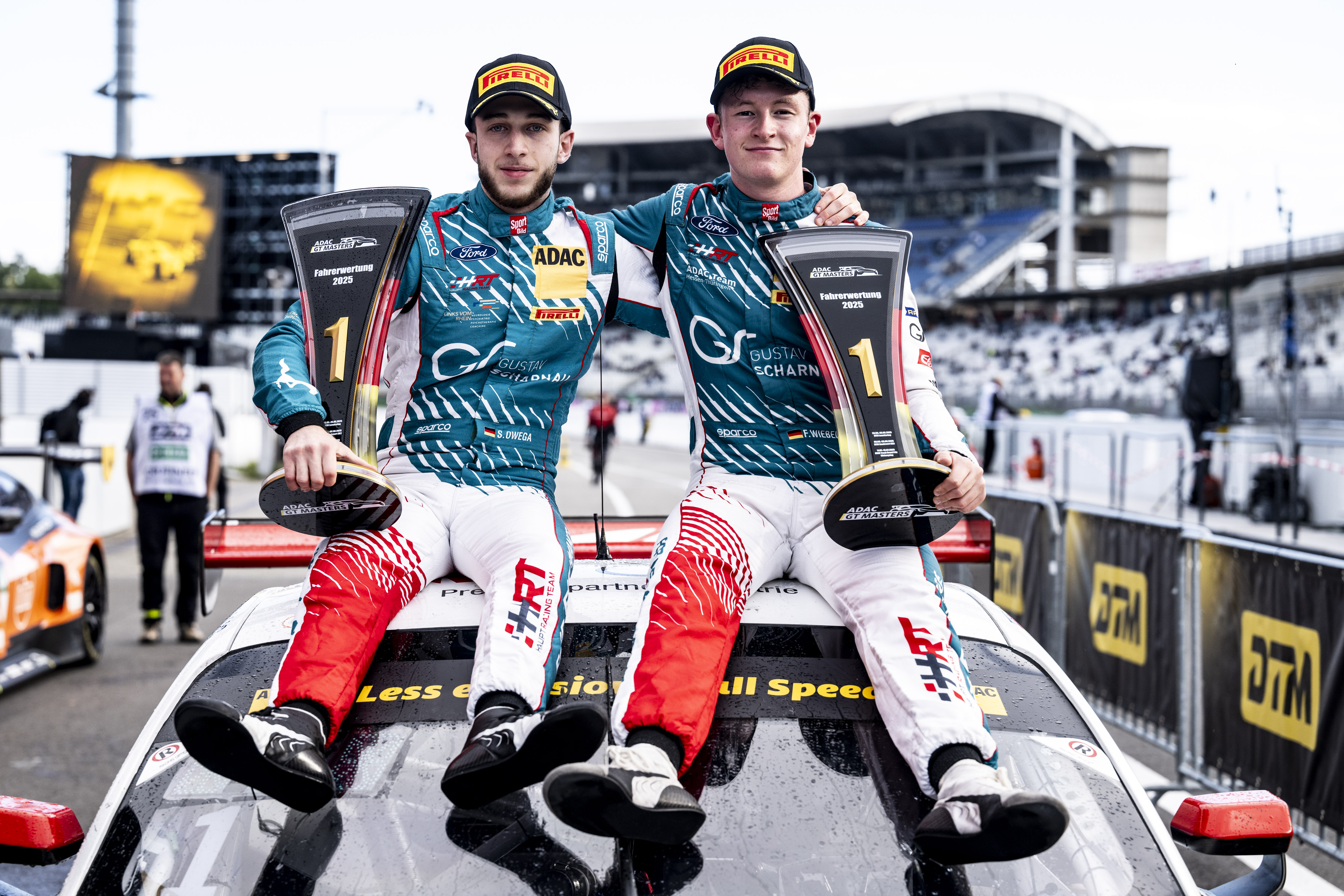 Die Champions des ADAC GT Masters in Höchstform: Salman Owega (20/Köln)/Finn Wiebelhaus (19/Obertshausen/beide Haupt Racing Team) haben das letzte Rennen der Saison in Hockenheim für sich entschieden. Das Duo lag im Ford Mustang GT3 1,770 Sekunden vor den neuen Vizemeistern Tim Zimmermann (29/Langenargen)/Leyton Fourie (20/RSA/beide FK Performance Motorsport) mit dem BMW M4 GT3 Evo. „Ich bin so happy, dass wir dieses Rennen noch gewinnen konnten. Wir haben die Saison stark begonnen und sie auch so beendet“, jubelte Wiebelhaus. „Ich wusste, dass ich im Rennen hier schnell sein würde. Nach dem Gewinn der Meisterschaft konnte ich endlich komplett frei fahren und absolut alles geben. Es hat einfach nur Spaß gemacht.“ Teamkollege Owega fügte hinzu: „Besser hätten wir die Saison nicht beenden können. Ich hatte schon erwartet, dass Finn noch ein bisschen nach vorne kommt, aber dass es so gut ausgeht, hätte ich nicht gedacht.“ Das Podium komplettierten die Vortagessieger Nico Hantke (21/Hürth)/Denis Bulatov (26/Scherer Sport PHX) im Audi R8 LMS GT3 Evo 2.
