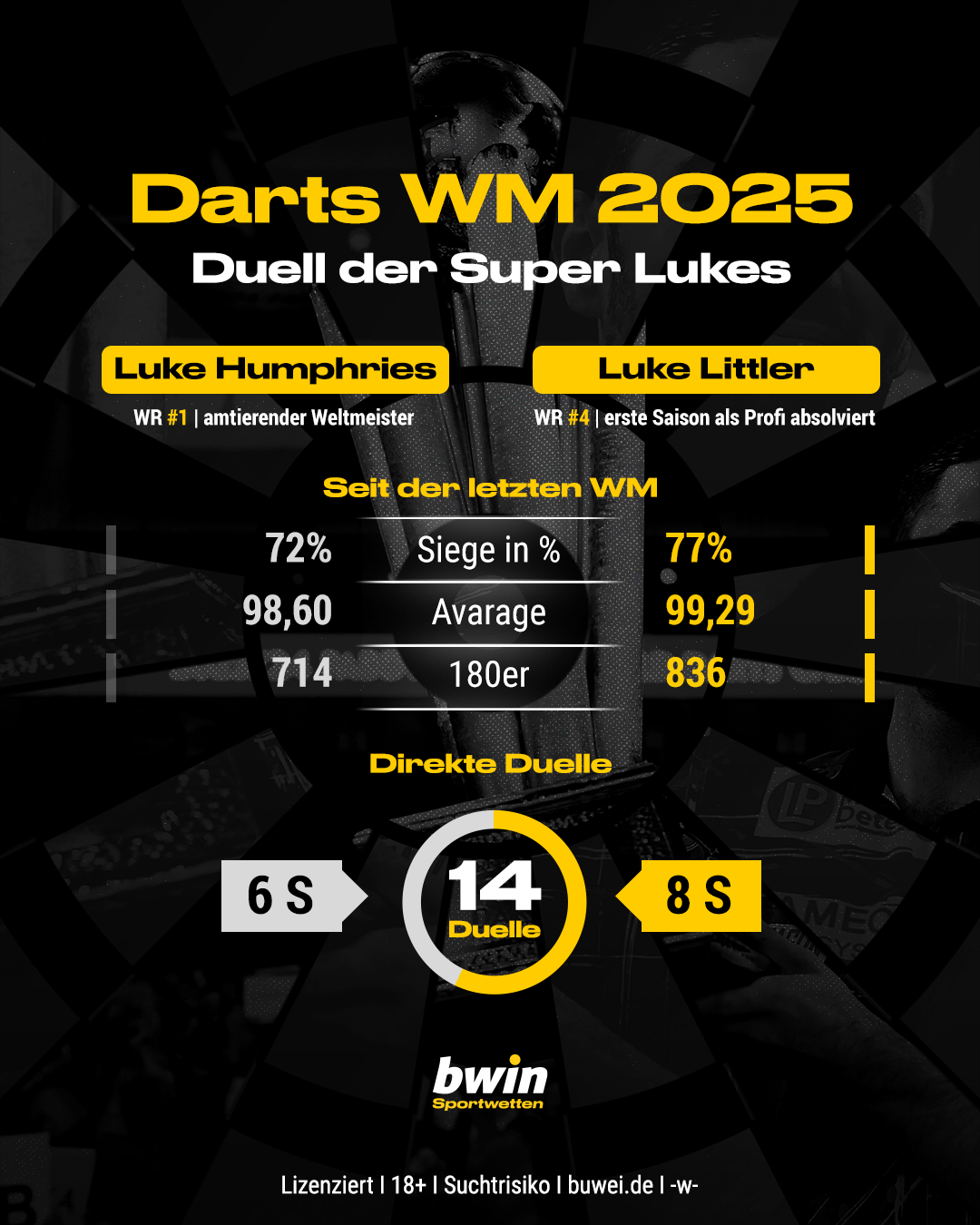 Top-Favorit im legendären Alexandra Palace ist laut bwin Vorjahresfinalist Luke Littler. Der 17-jährige Teenager liegt mit Titel-Quote 2,87 beim Sportwettenanbieter knapp vor seinem englischen Landsmann Luke Humphries (Quote 4,33), der ihm im vergangenen Jahr den Titel im Finale wegschnappte.