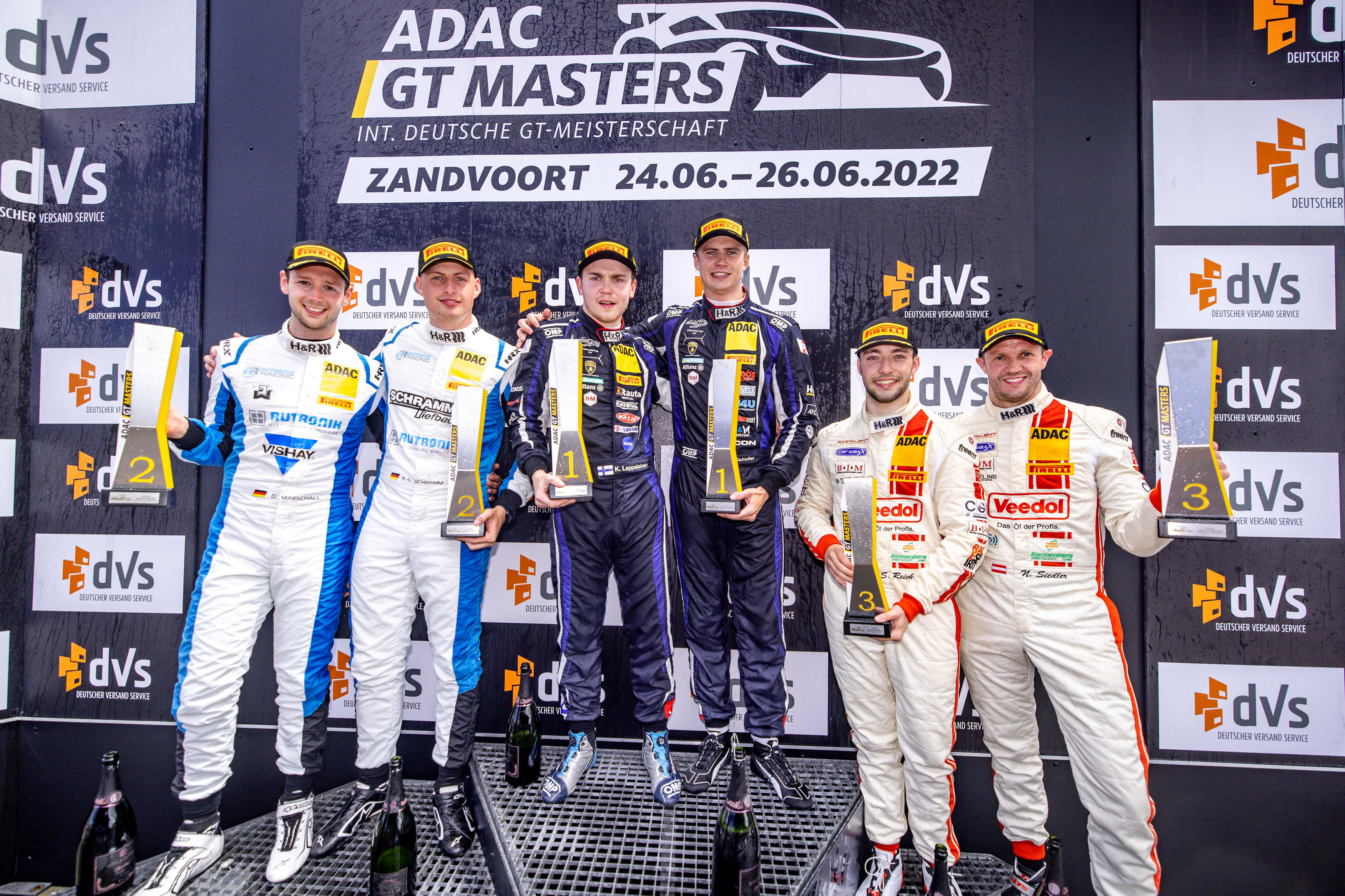Perfekte Strategie, gekonnte Umsetzung: Mick Wishofer (22/A) und Konsta Lappalainen (20/FIN) haben im Lamborghini Huracán GT3 Evo #14 das Samstagsrennen auf dem niederländischen Circuit Zandvoort gewonnen. Auf Platz eins gestartet, zeigte das Fahrer-Duo bei schwierigen Bedingungen eine fehlerlose Leistung und bescherte seinem Team Emil Frey Racing den ersten Sieg bei der Debütsaison in der Deutschen GT-Meisterschaft. "Das ist ein toller Erfolg und der erste Sieg für mich und unser neues Team. Bei den schwierigen Bedingungen hatten wir keine Probleme und konnten unser Rennen von vorn kontrollieren", sagte der junge Finne nach dem fehlerlosen Auftritt. Dahinter krönten Kim-Luis Schramm (24/Meuspath) und Dennis Marschall (25/Eggenstein) vom Team Rutronik Racing eine tolle Aufholjagd und kämpften sich mit dem Audi R8 LMS GT3 Evo II #27 vom achten auf den zweiten Rang vor. Dritter wurden die Markenkollegen Simon Reicher (22/A) und Norbert Siedler (39/A), die im Audi R8 LMS GT3 Evo II mit der Startnummer 54 den ersten Podiumsplatz für das Eastalent Racing Team im ADAC GT Masters holten.
