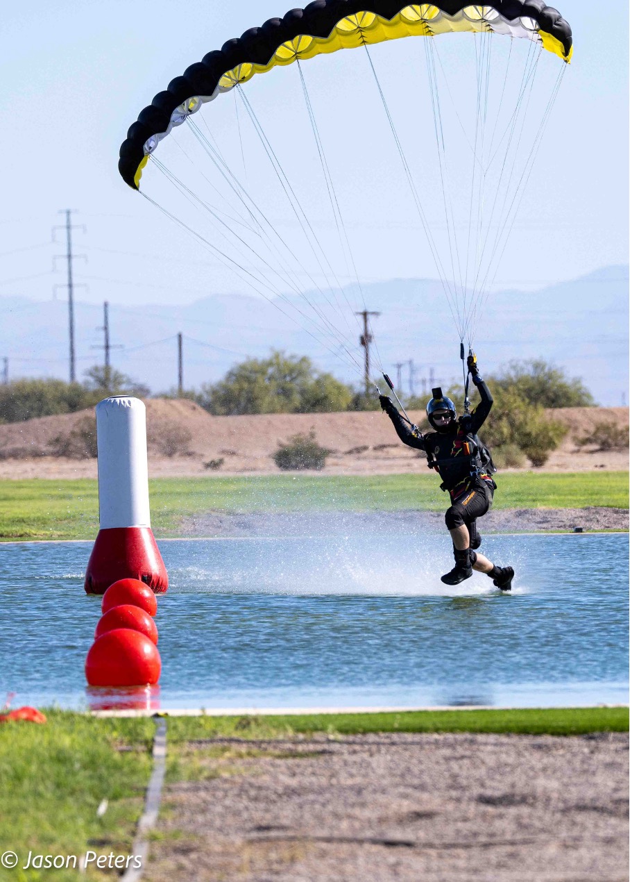… auf deutsch Kappenfliegen - wird in drei Disziplinen, Accuracy (Genauigkeit), Speed (Geschwindigkeit) und Distance (Weite), mit jeweils drei Sprüngen mit speziellen Schirmen und Ausrüstung ausgetragen. Bei Accuracy soll der Springer nach dem Wasserkontakt möglichst zielgenau und im Stehen landen, bei Speed ein Parcours schnellstmöglich durchflogen werden und bei Drag Distance soll nach Wasserkontakt die größte Weite erreicht werden. Im Accuracy werden maximal 100 Punkte vergeben, Im Speed werden die Zeiten in Tausendstel gemessen und liegen knapp über zwei Sekunden, bei Distance werden Entfernungen bis gut 220 Meter erreicht.